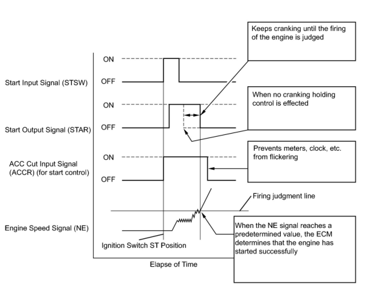 The cranking holding control system provides current to the starter when the ECM detects the ignition switch's start signal (STSW). When the ECM performs a firing judgment, the system cuts current to the starter. When an ECM receives the STSW signal, it turns on the ST CUT relay, which prevents flickering of the combination meter assembly, clock, audio system, etc. Also, the ECM sends a signal to the ECM's STAR terminal. Then the STAR output signal travels through the park/neutral position (PNP) switch to the ST relay, causing the starter to activate.