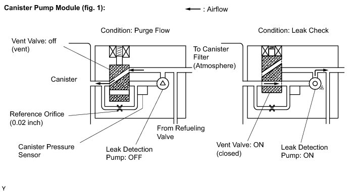 The leak detection pump creates negative pressure (vacuum) in the EVAP system and the pressure is measured. Finally, the ECM monitors for leaks from the EVAP system, malfunctions in both the canister pump module and purge VSV, based on the EVAP pressure.