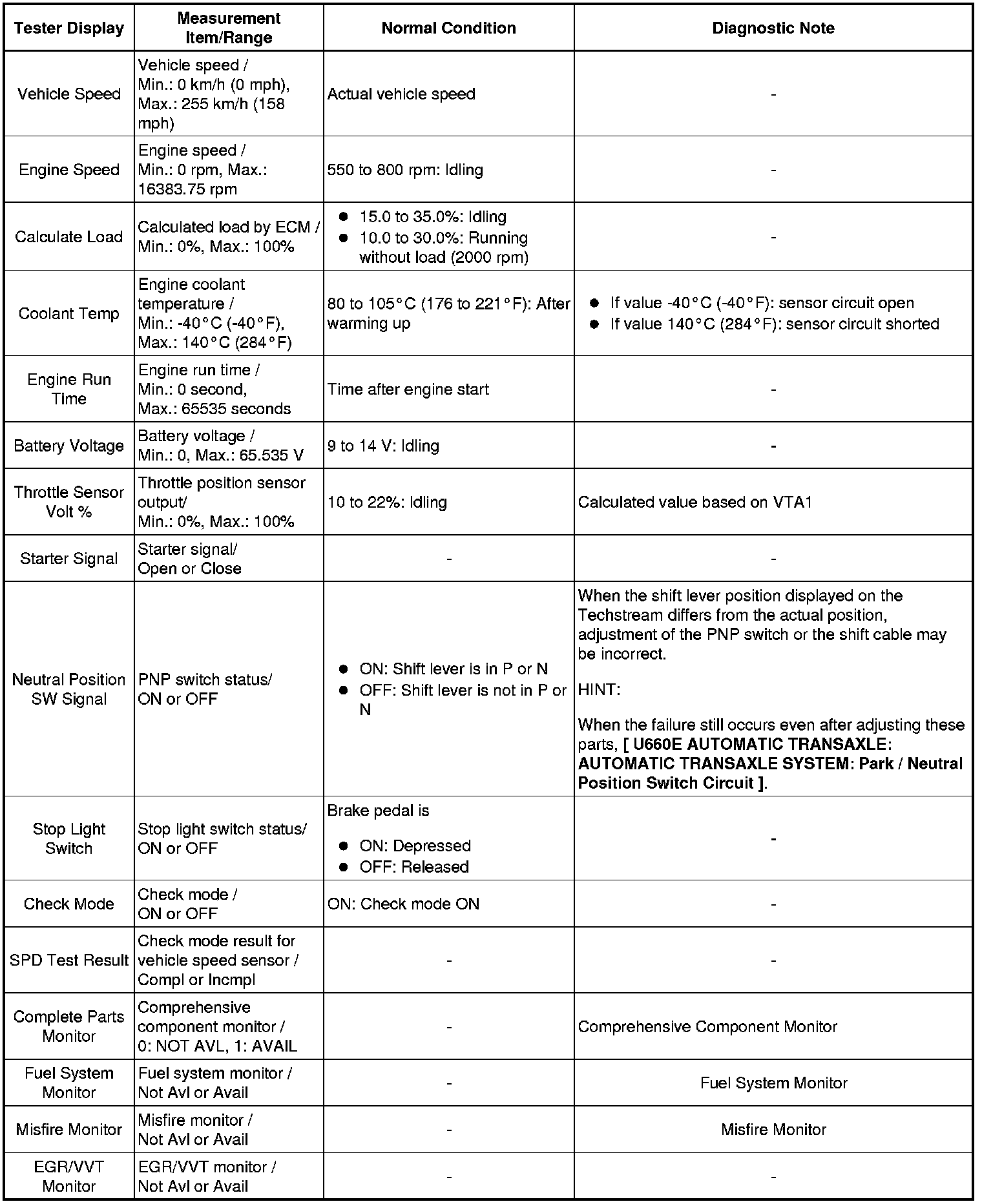 Using Techstream to read the Data List allows the values or states of switches, sensors, actuators and other items to be read without removing any parts. This non-intrusive inspection can be very useful because intermittent conditions or signals may be discovered before parts or wiring is disturbed. Reading the Data List information early in troubleshooting is one way to save diagnostic time.
