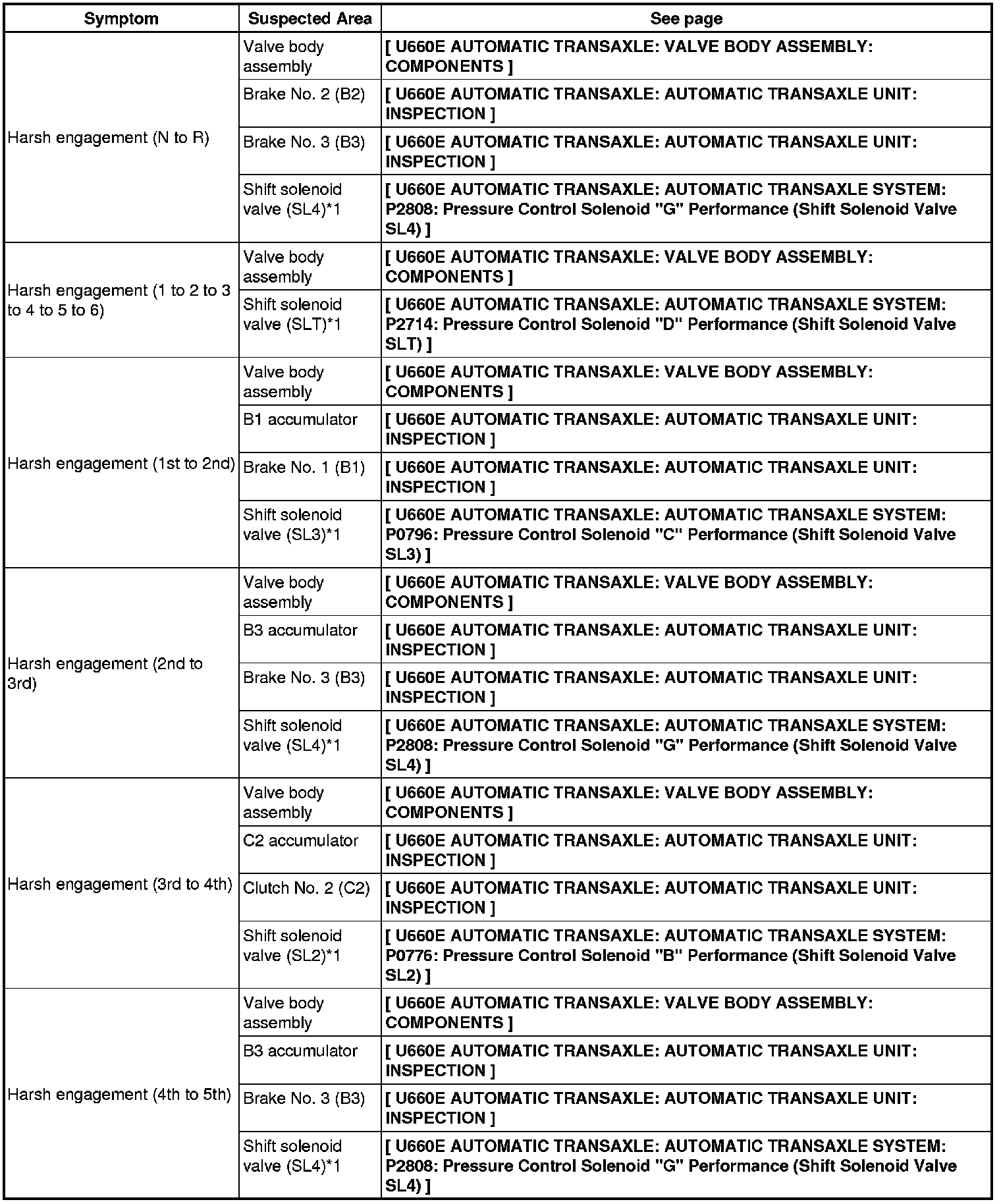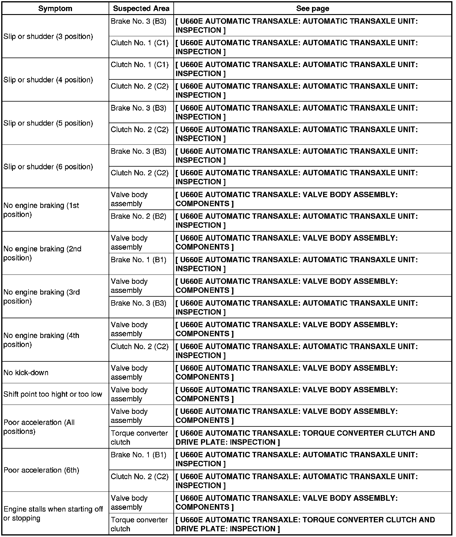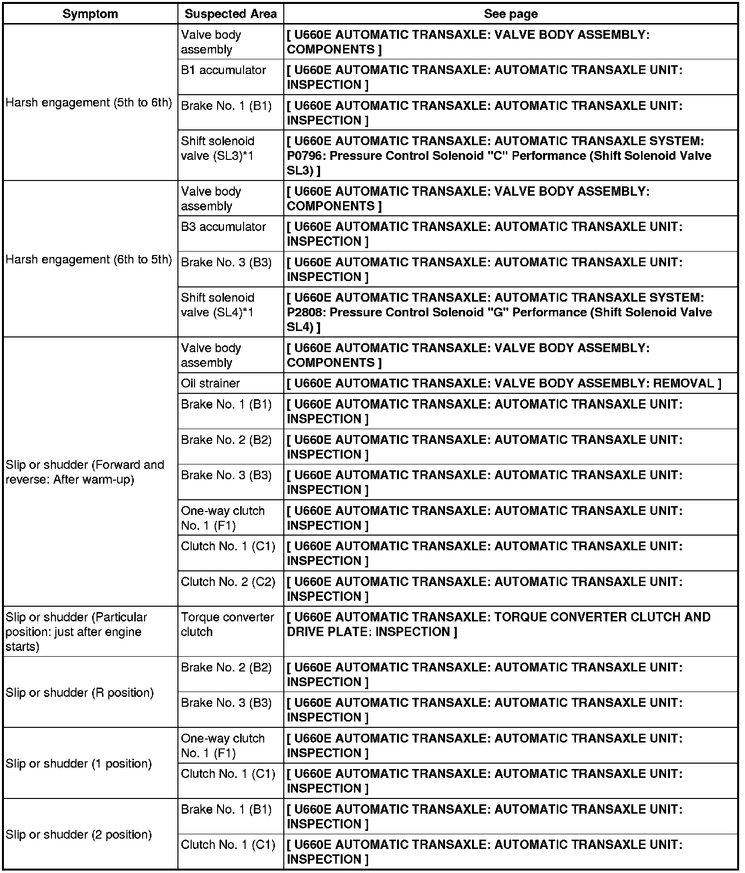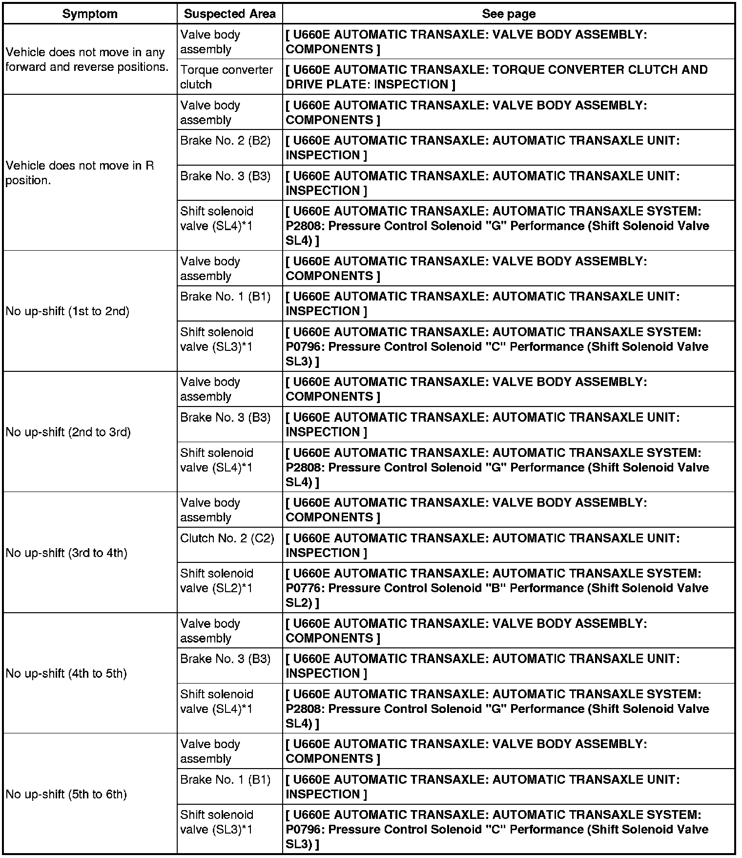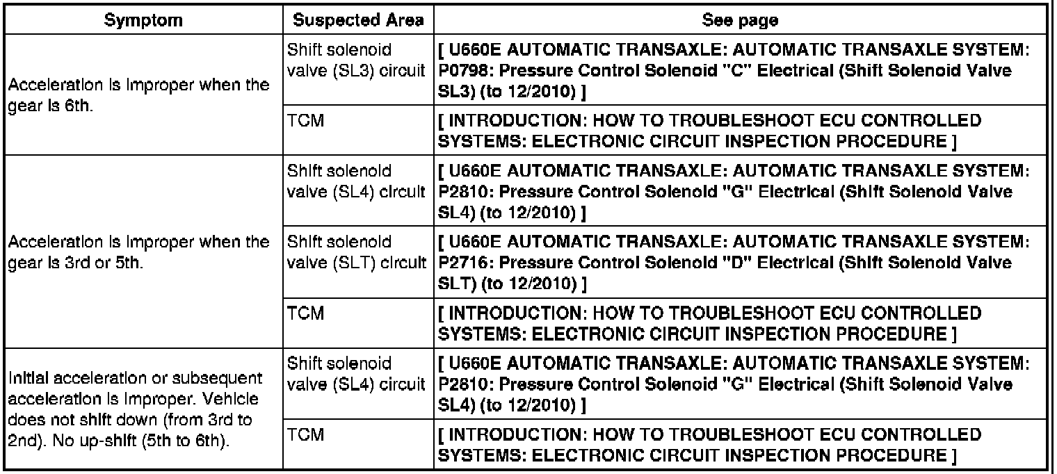 U660E AUTOMATIC TRANSAXLE: AUTOMATIC TRANSAXLE SYSTEM: PROBLEM SYMPTOMS TABLE