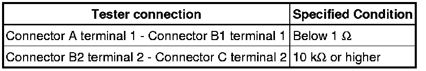 * If the results match the examples above, an open circuit exists in the wire harness between terminal 1 of connector B and terminal 1 of connector C.