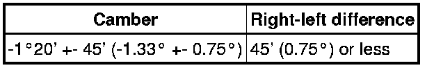 Camber is not adjustable. If the measurement is not within the specification range, inspect the suspension parts for damage and/or wear, and replace them if necessary.