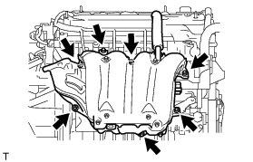 (e) Remove the 5 bolts, 2 nuts and intake manifold.