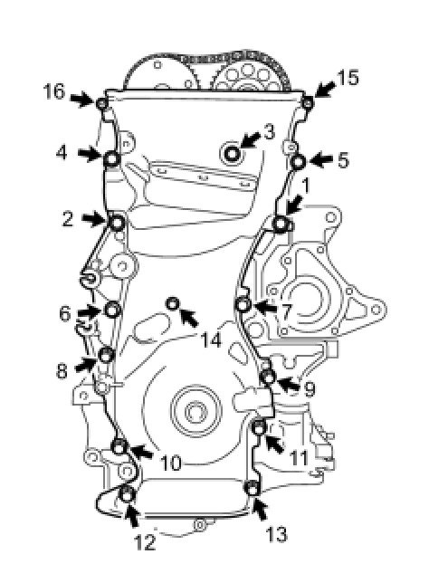 TIMING CHAIN COVER SUB-ASSEMBLYTemporarily tighten the timing chain cover with the 14 bolts and 2 nuts.