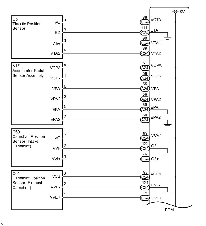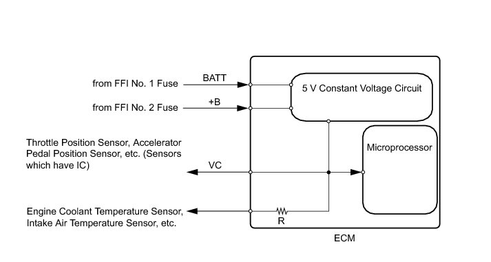 The ECM constantly generates 5 V of power from battery voltage supplied to the +B (BATT) terminal to operate the microprocessor. The ECM also provides this power to the sensors through the VC output circuit.