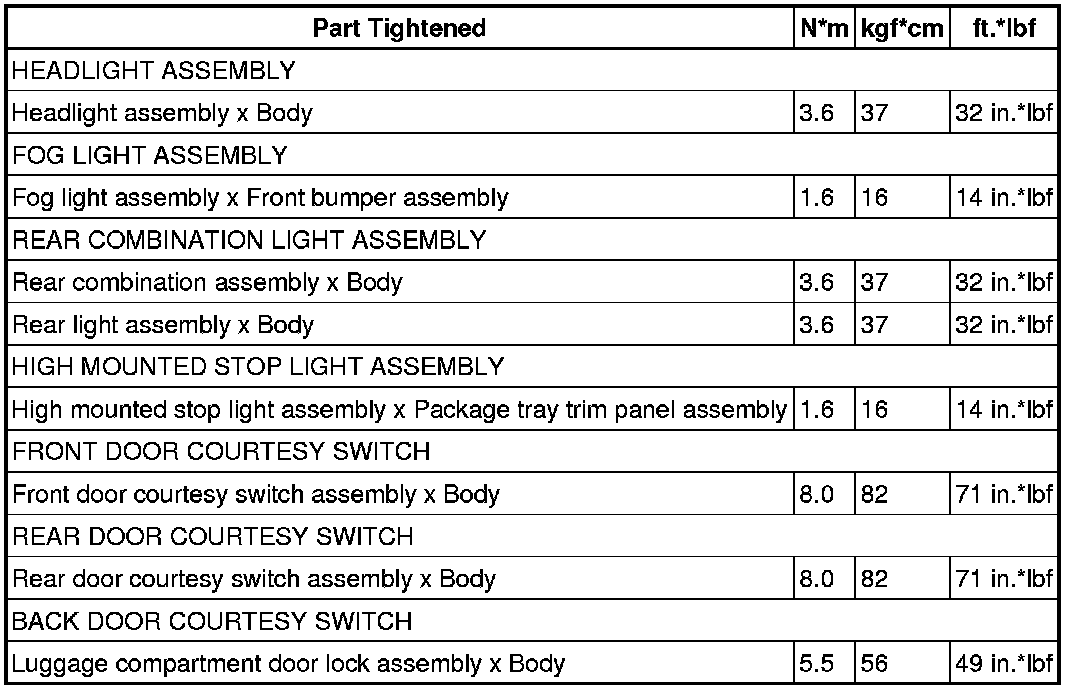 SERVICE SPECIFICATIONS: LIGHTING: TORQUE SPECIFICATIONS