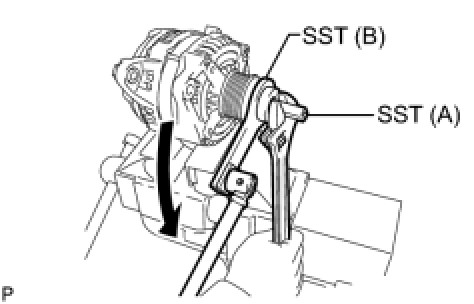 (c) Use a wrench to hold SST (A), and turn SST (B) counterclockwise to loosen the generator pulley.