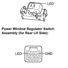 (1) Apply battery voltage to the power window regulator switch assembly and check that the LED illuminates.