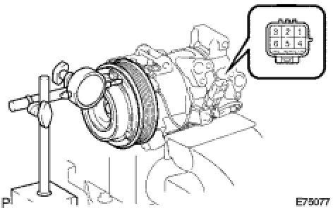 (b) Connect the battery positive lead to terminal 1 of the magnetic clutch connector, and the negative lead to the ground wire. Turn the magnetic clutch on and off and measure the clearance.