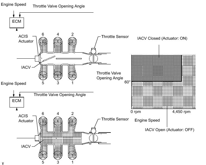 When the engine speed is between 0 and 4,450 rpm and the throttle valve opening angle is 60° or more, the ECM supplies current to the actuator (ON status), to close the IACV. Under other conditions, the actuator is usually OFF and the IACV is open.