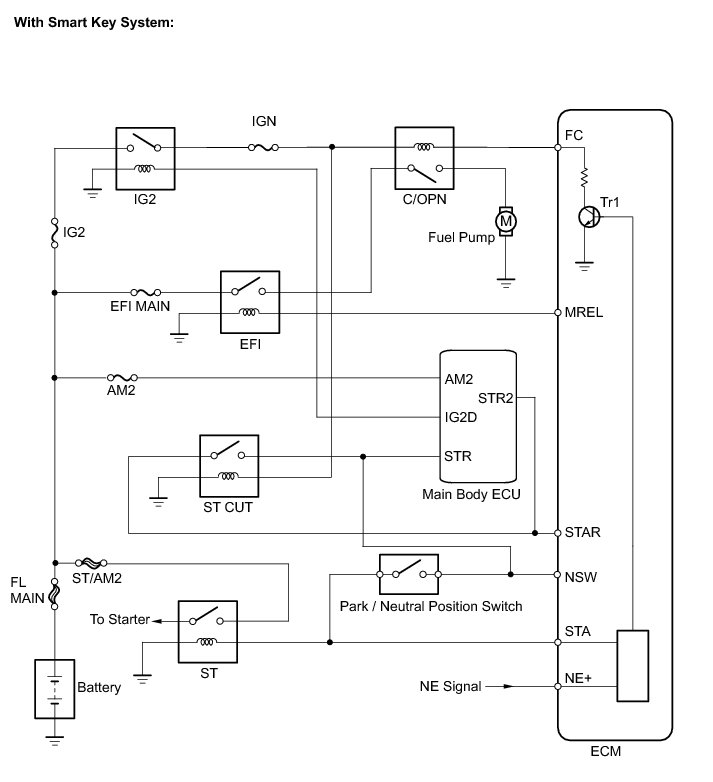 In the diagram below, when the engine is cranked, current flows from terminal ST1 (STR) of the ignition switch (main body ECU) to the starter relay (Marking: ST) coil and also current flows to terminal STA of ECM (STA signal).