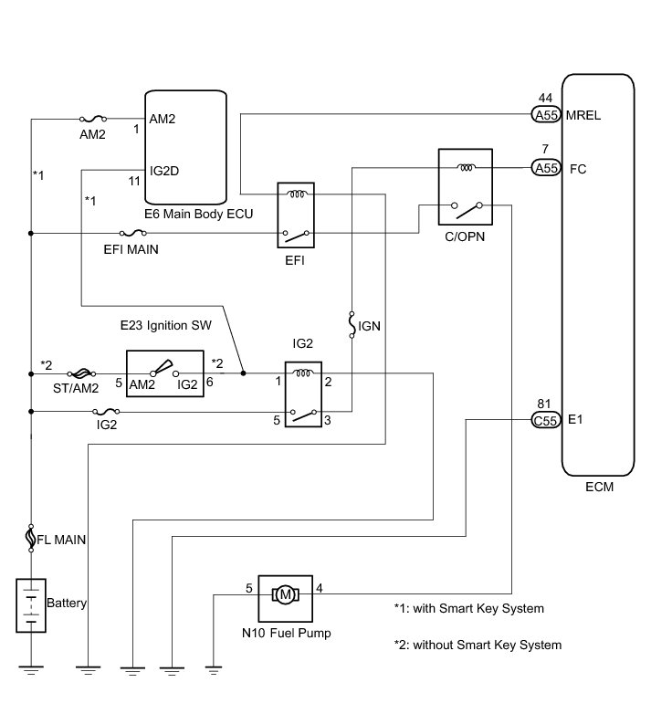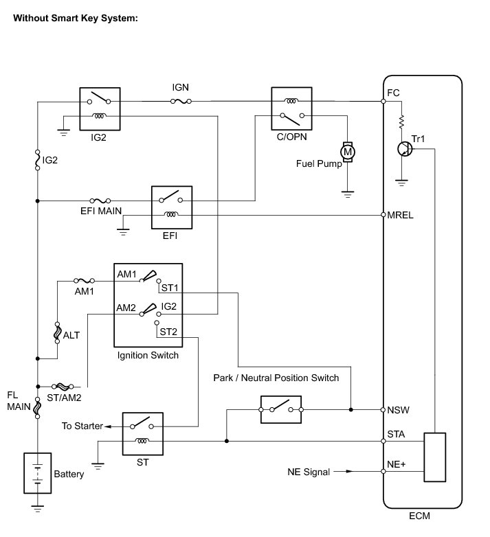 When the STA signal and NE signal are input to the ECM, Tr1 is turned ON, current flows to coil of the circuit opening relay (Marking: C/OPN), the relay switches on, power is supplied to the fuel pump and the fuel pump operates.