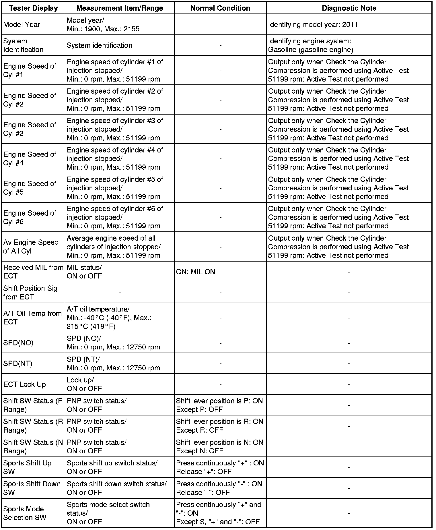 *2: While the Active Test item Check the Cylinder Compression is being performed, the fuel and ignition of all cylinders is cut. At this time, the ECM measures the speed of each cylinder while the engine is being cranked.