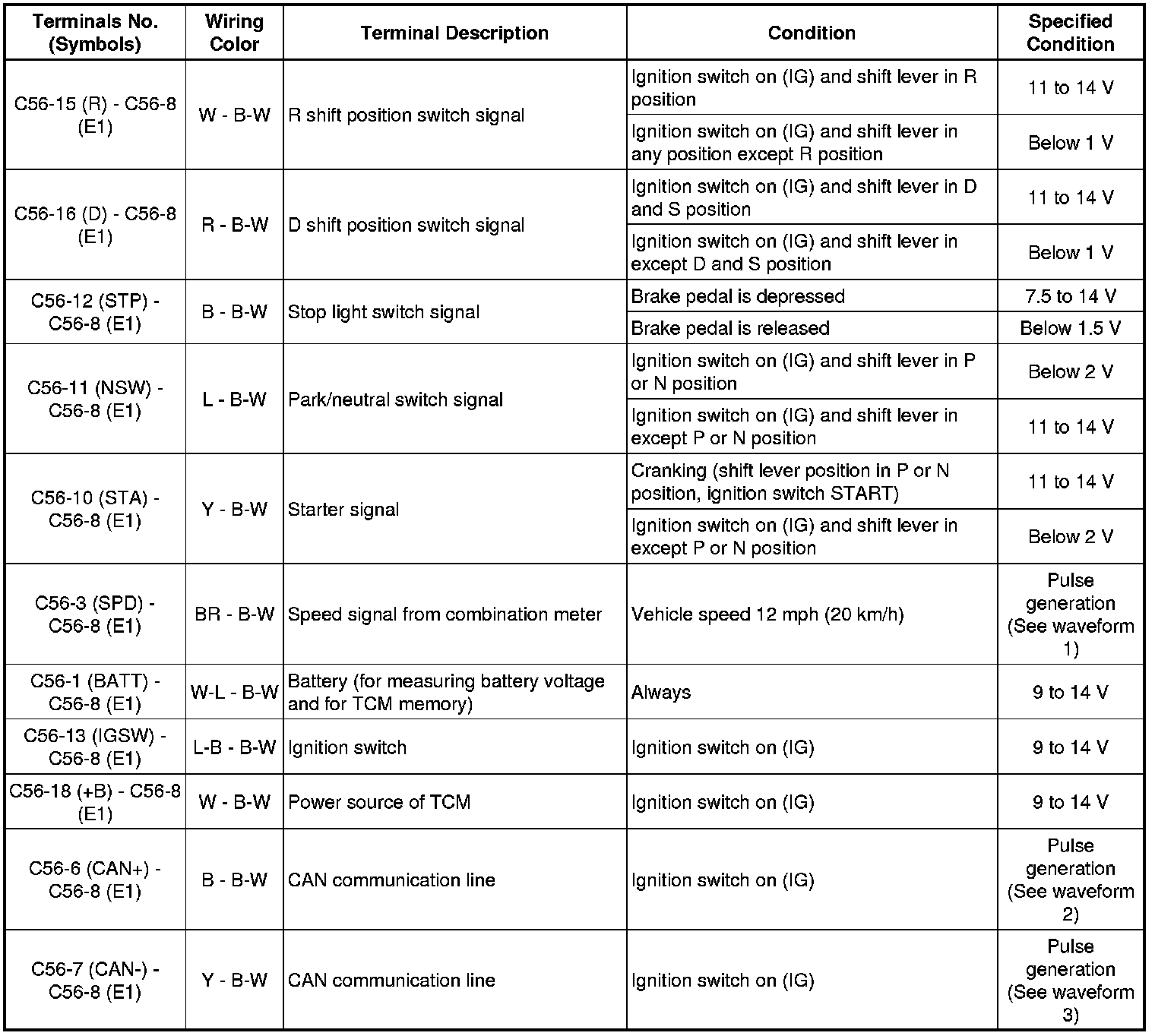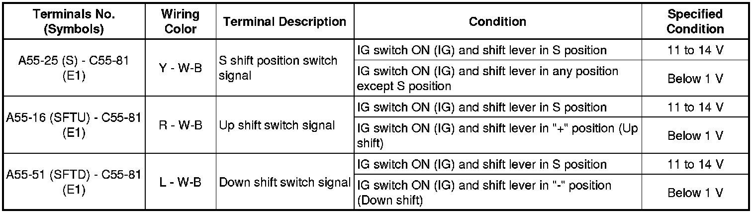 In the table, first follow the information under "Condition". Look under "Terminals No. (Symbols)" for the terminals to be inspected. The standard voltage between the terminals is shown under "Specified Condition".