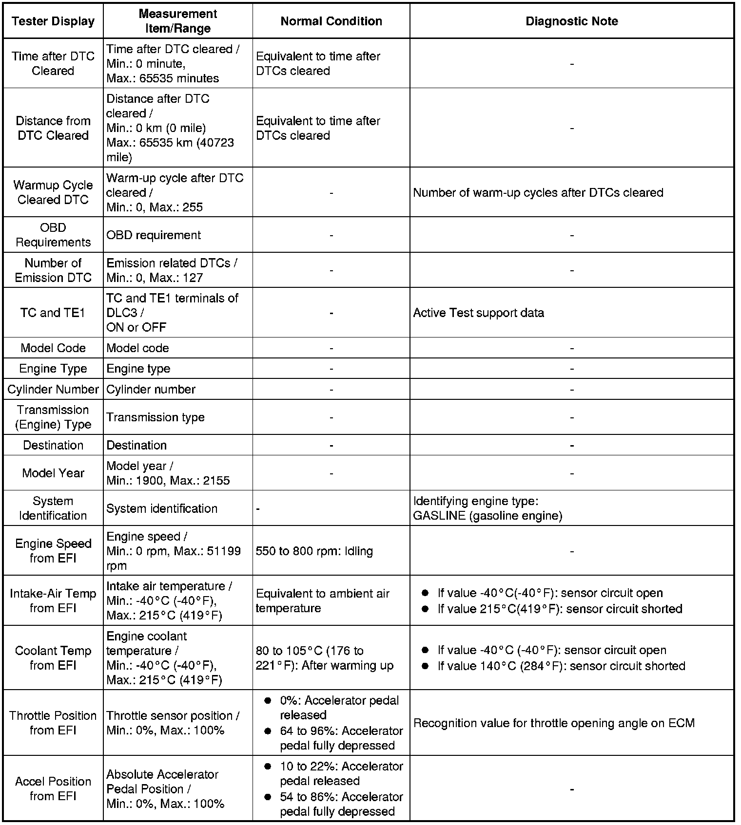 Using Techstream to read the Data List allows the values or states of switches, sensors, actuators and other items to be read without removing any parts. This non-intrusive inspection can be very useful because intermittent conditions or signals may be discovered before parts or wiring is disturbed. Reading the Data List information early in troubleshooting is one way to save diagnostic time.