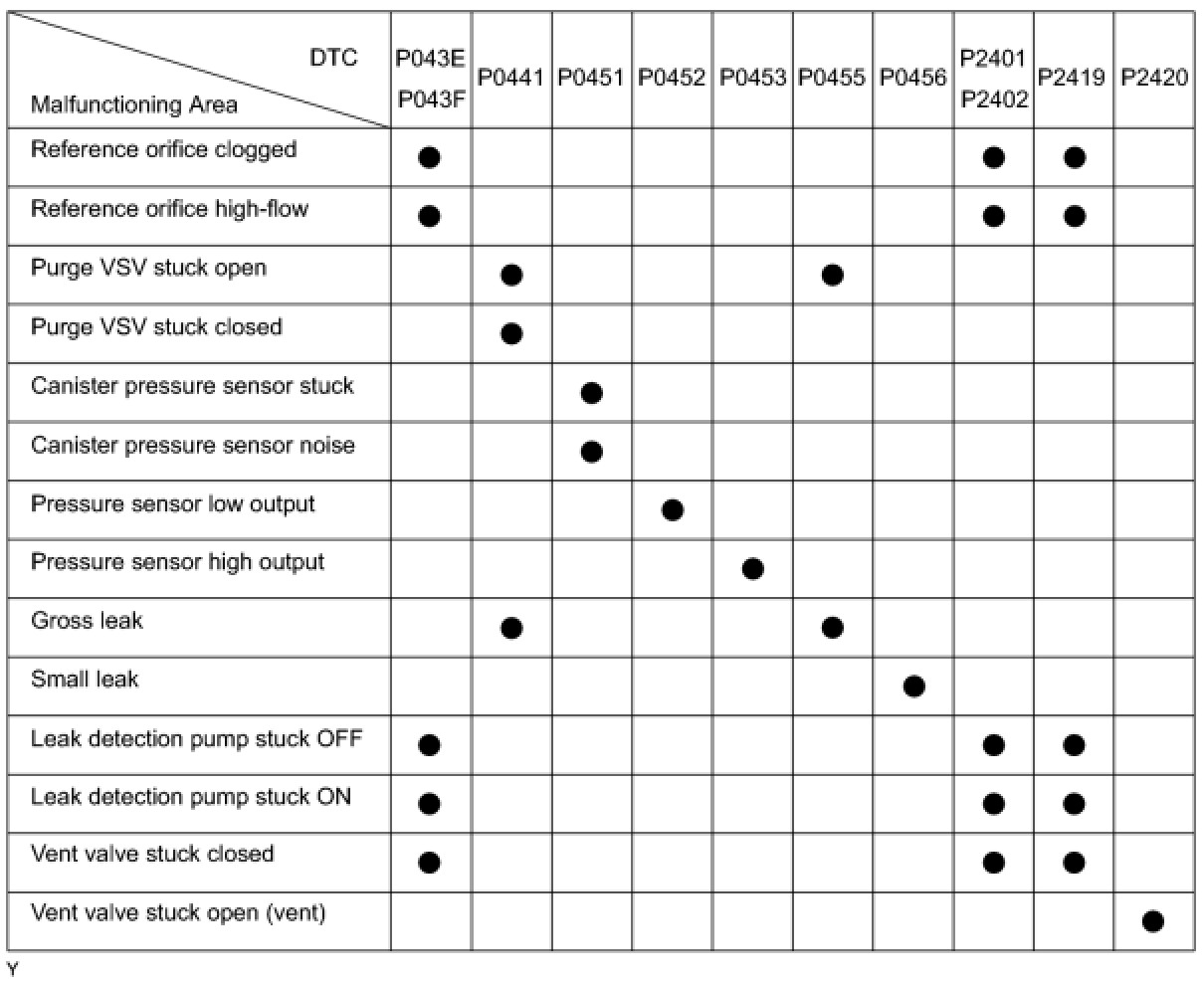 If the reference pressure difference between the first and second checks is greater than the specification, all the DTCs relating to the reference pressure (P043E, P043F, P2401, P2402 and P2419) are stored.
