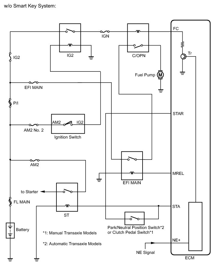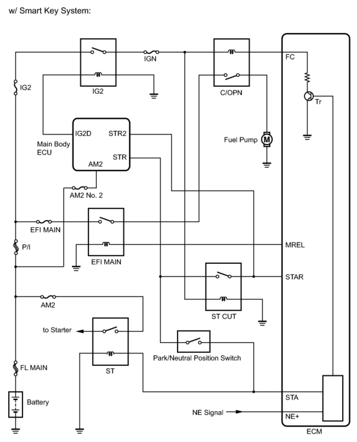 In the diagram below, when the engine is cranked, the starter relay drive signal output from the STAR terminal of the ECM is input to the STA terminal of the ECM, and NE signal generated by the crankshaft position sensor is also input to the NE+ terminal.