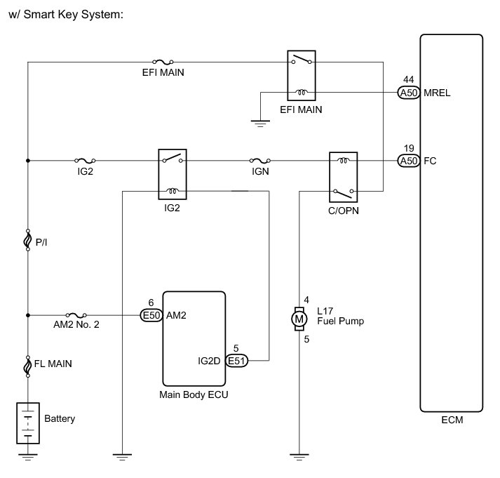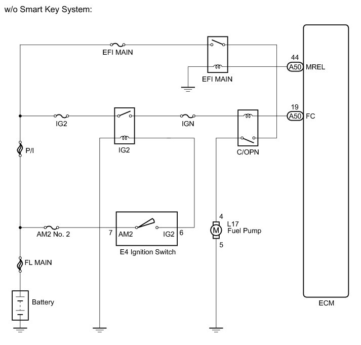 When the STA signal and NE signal are input to the ECM, Tr is turned on, current flows to the coil of the circuit opening (C/OPN) relay, the relay switches on, power is supplied to the fuel pump and the fuel pump operates.
