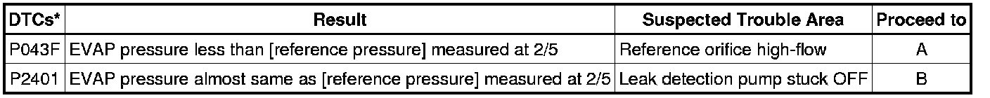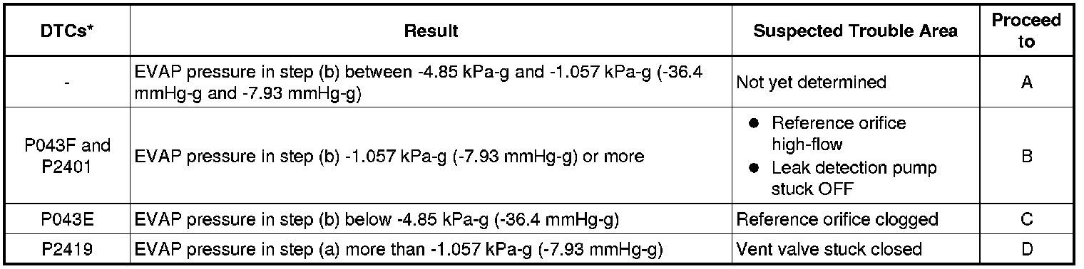 If the reference pressure difference between the first and second checks is greater than the specification, all the DTCs relating to the reference pressure (P043E, P043F, P2401, P2402 and P2419) are stored.