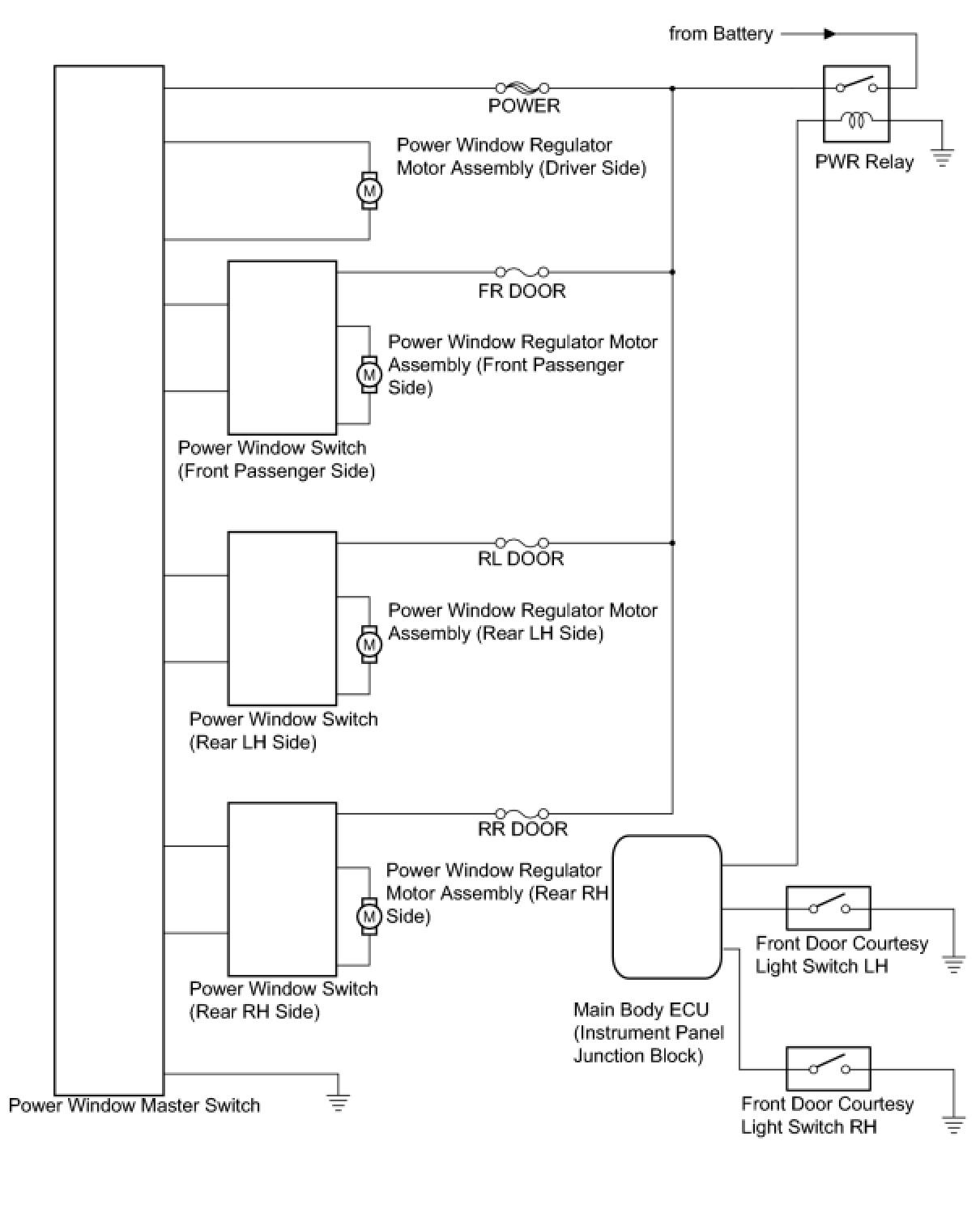 The main controls of this system are: the power window master switch which is built into the driver side door, and the power window switches which are built into the front passenger side door and rear doors. Pressing the switch or any of the switches on the master switch transmits an UP or DOWN signal to the corresponding power window regulator motor.