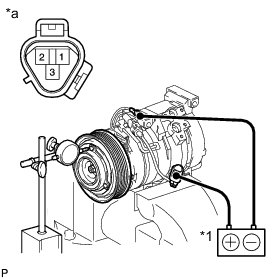 (c) Connect the battery positive lead to terminal 3 (MG+) of the magnet clutch connector and the negative lead to the ground wire. Turn the magnet clutch on and off and measure the clearance.
