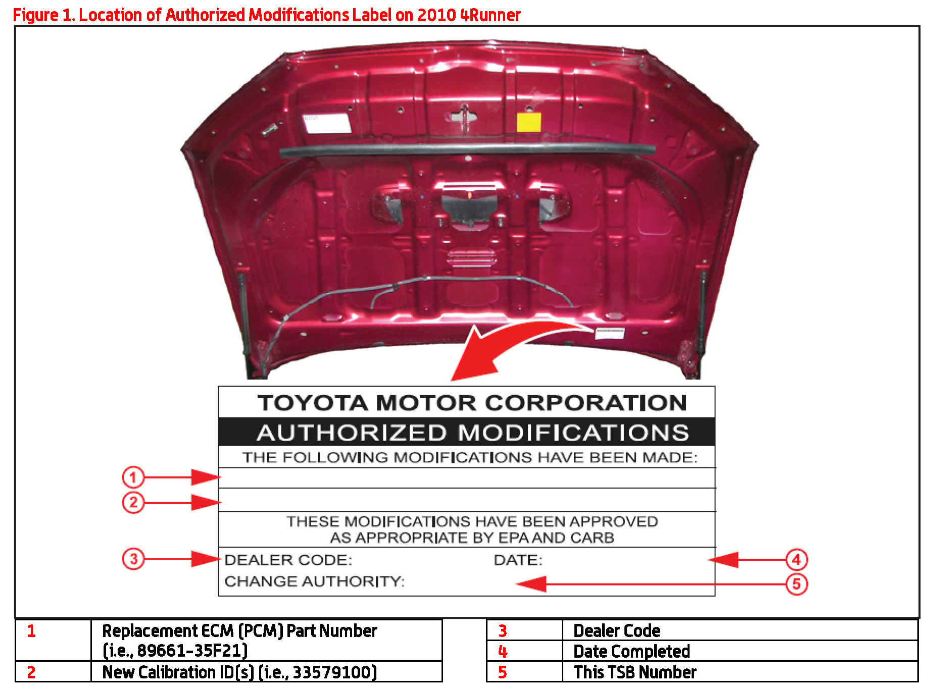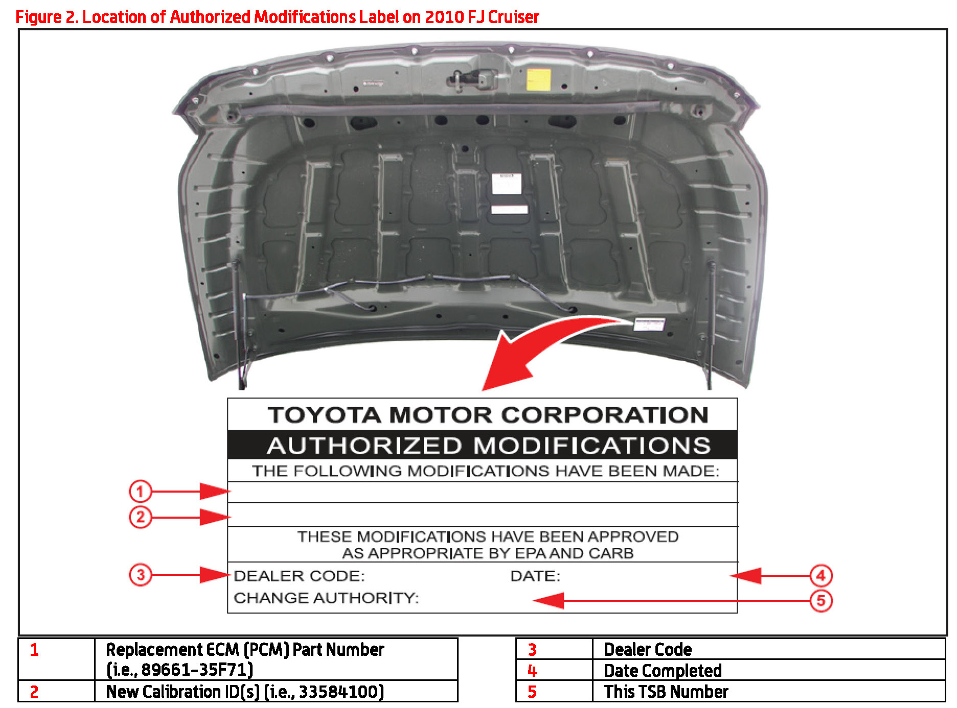 2. Check for the Authorized Modifications Label affixed to the vehicle in the location shown in Figure 1 or 2. Confirm if the ECM (PCM) calibration has been updated. If the calibration ID listed is NOT the latest ECM (PCM) calibration - go to step 3.