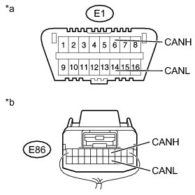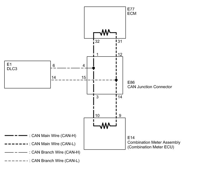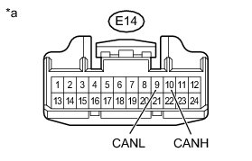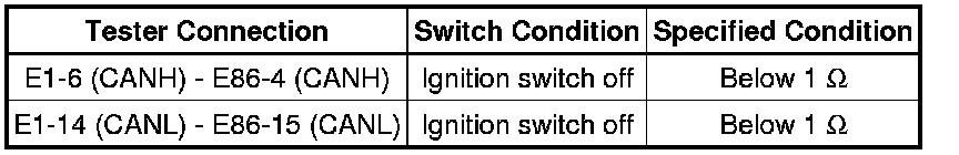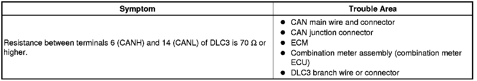 There may be an open circuit in the CAN main wire and/or DLC3 branch wire when the resistance between terminals 6 (CANH) and 14 (CANL) of the DLC3 is 70 Ohms or higher.