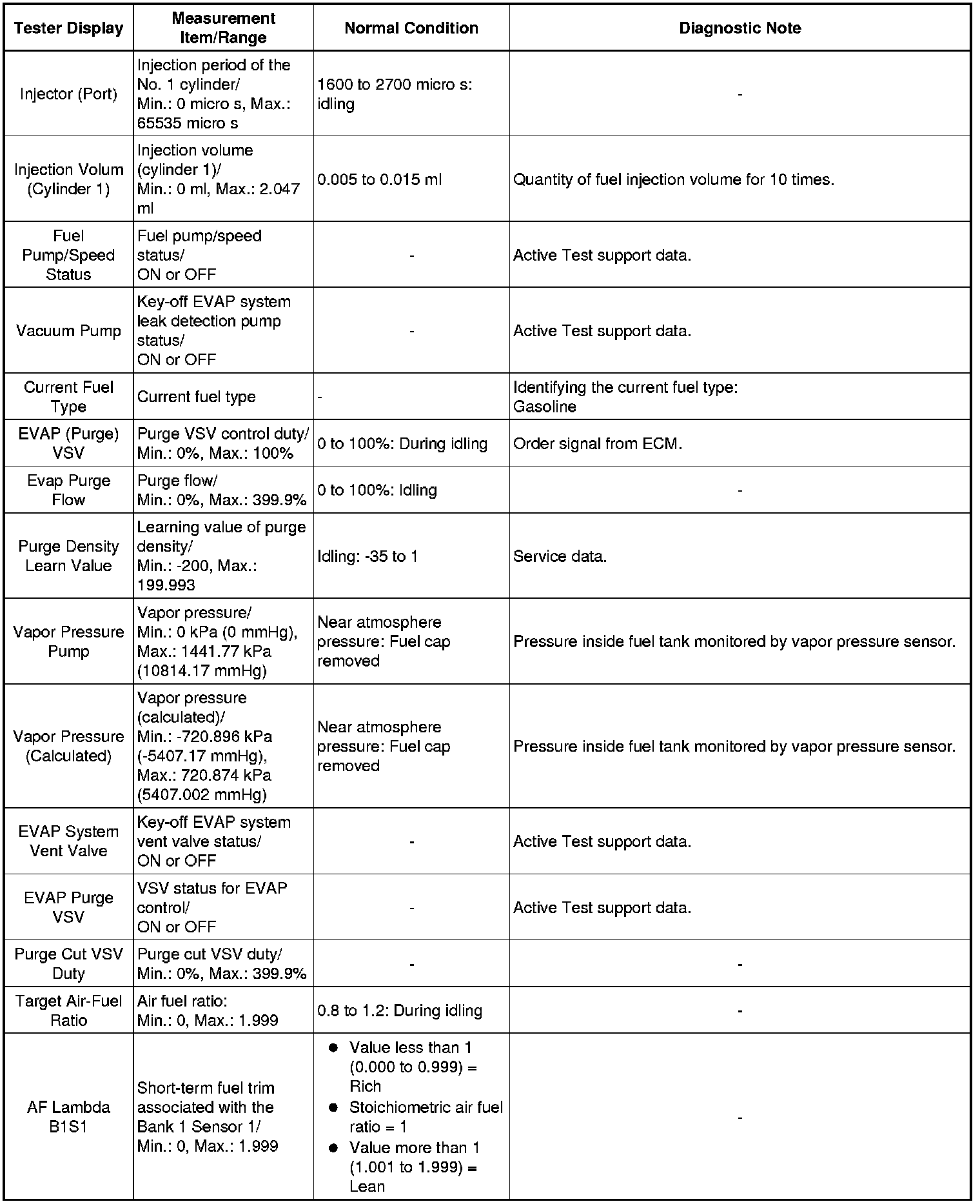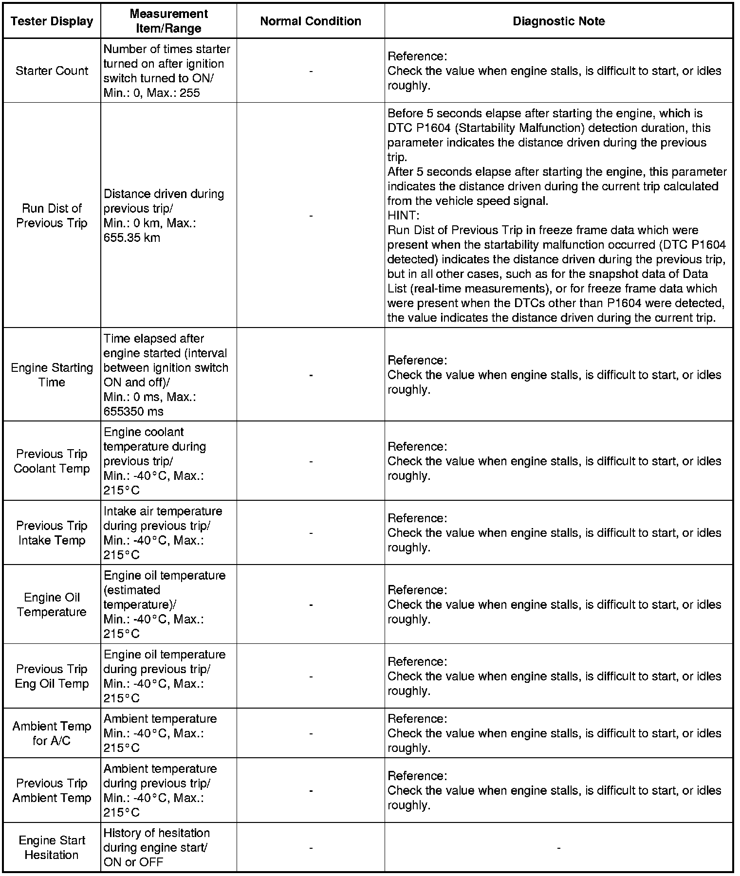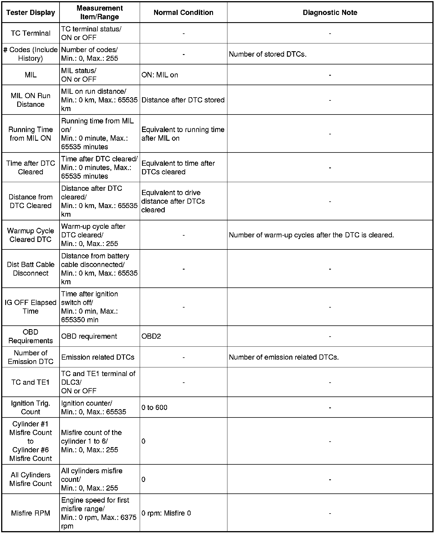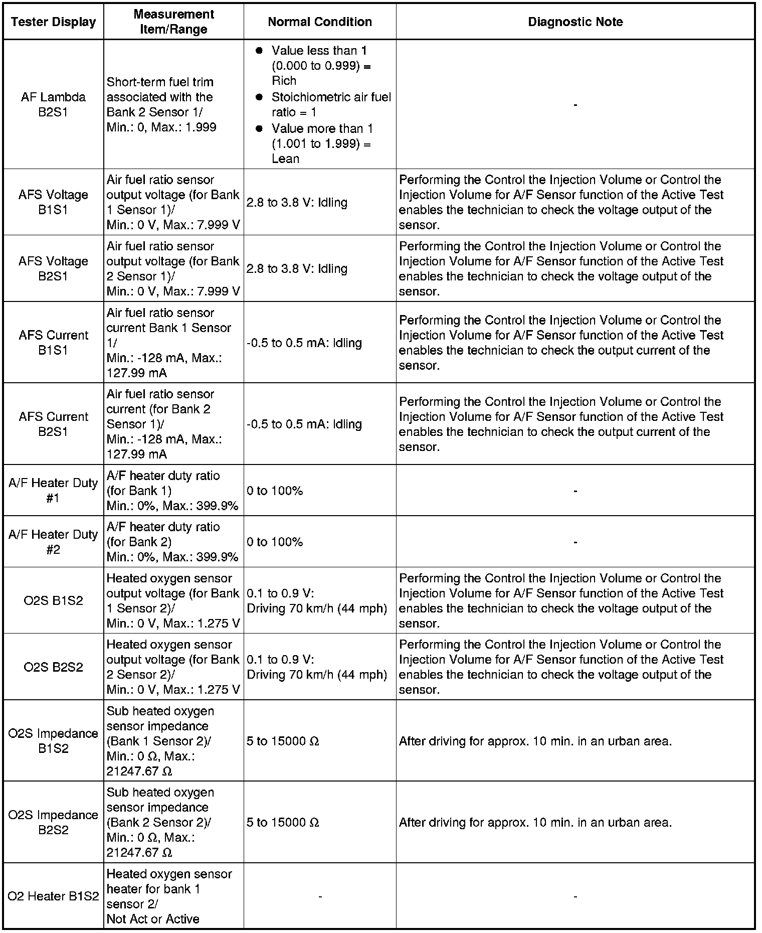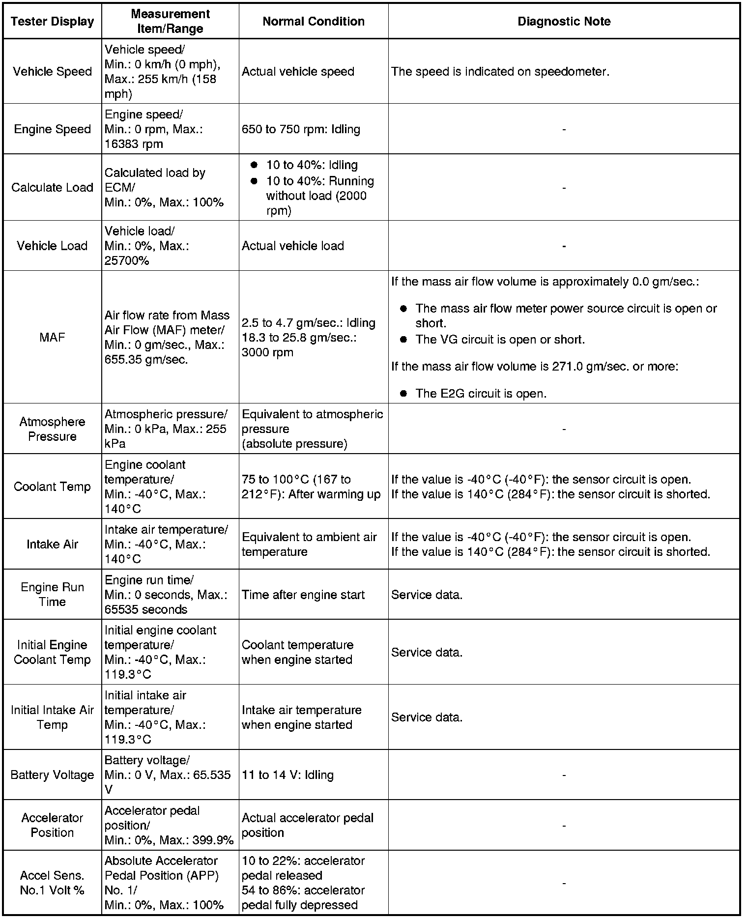 Using the Techstream to read the Data List allows the values or states of switches, sensors, actuators and other items to be read without removing any parts. This non-intrusive inspection can be very useful because intermittent conditions or signals may be discovered before parts or wiring is disturbed. Reading the Data List information early in troubleshooting is one way to save diagnostic time.
