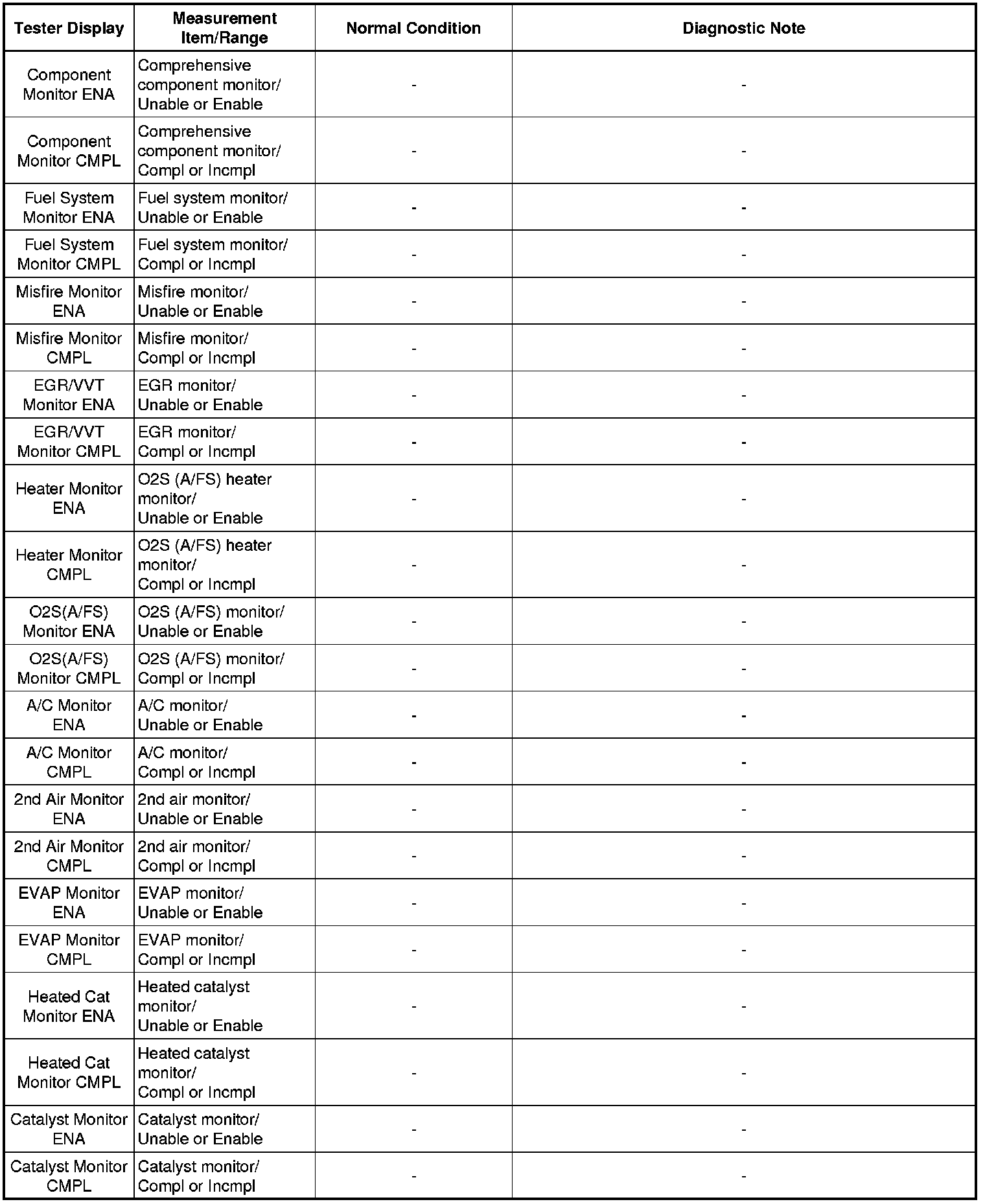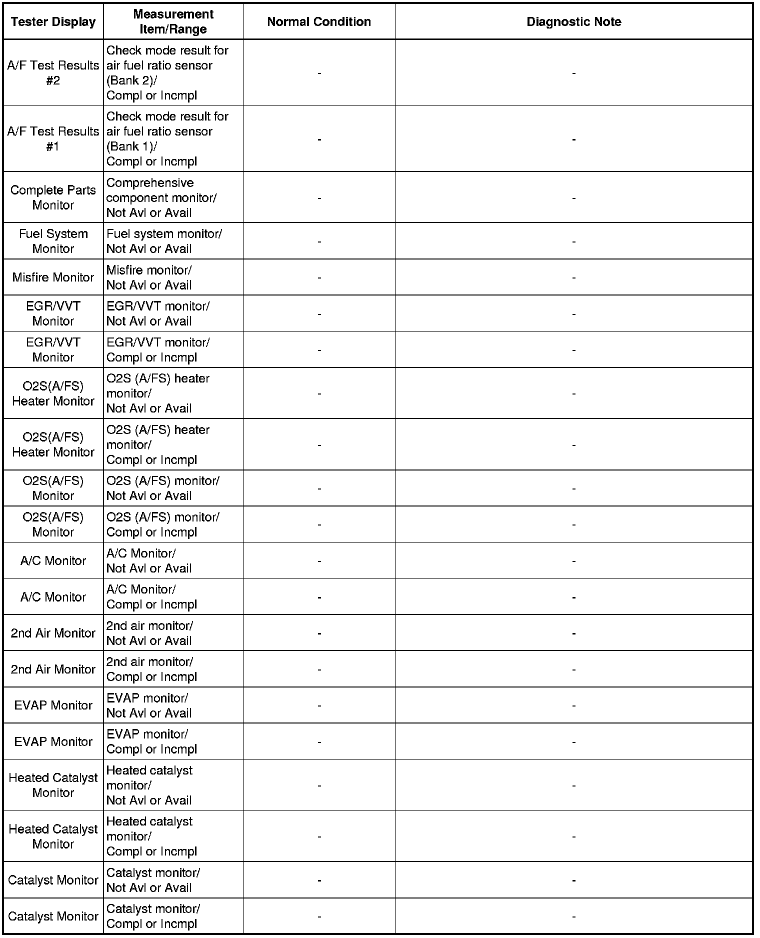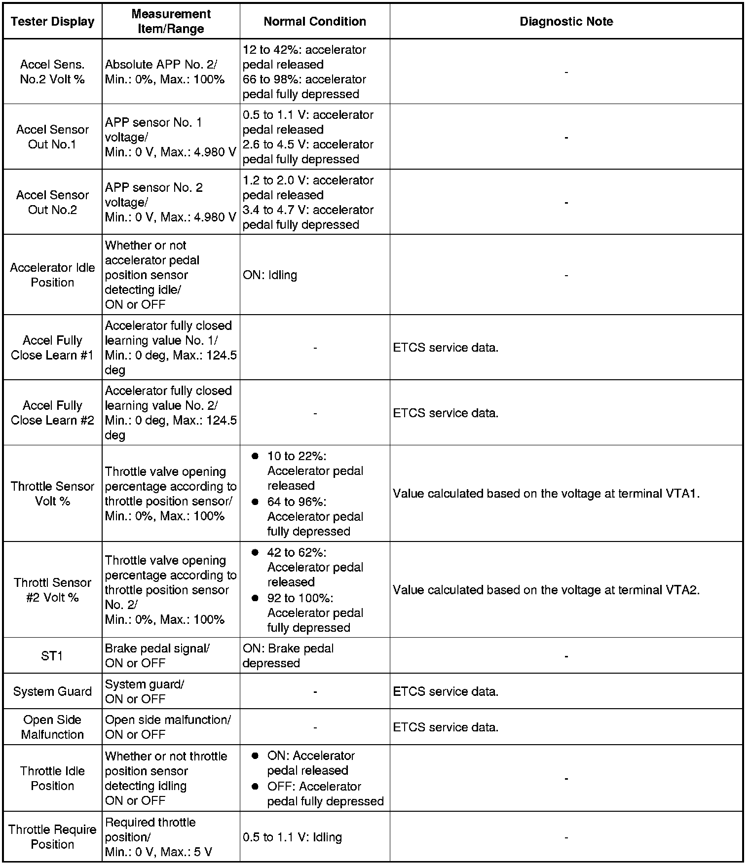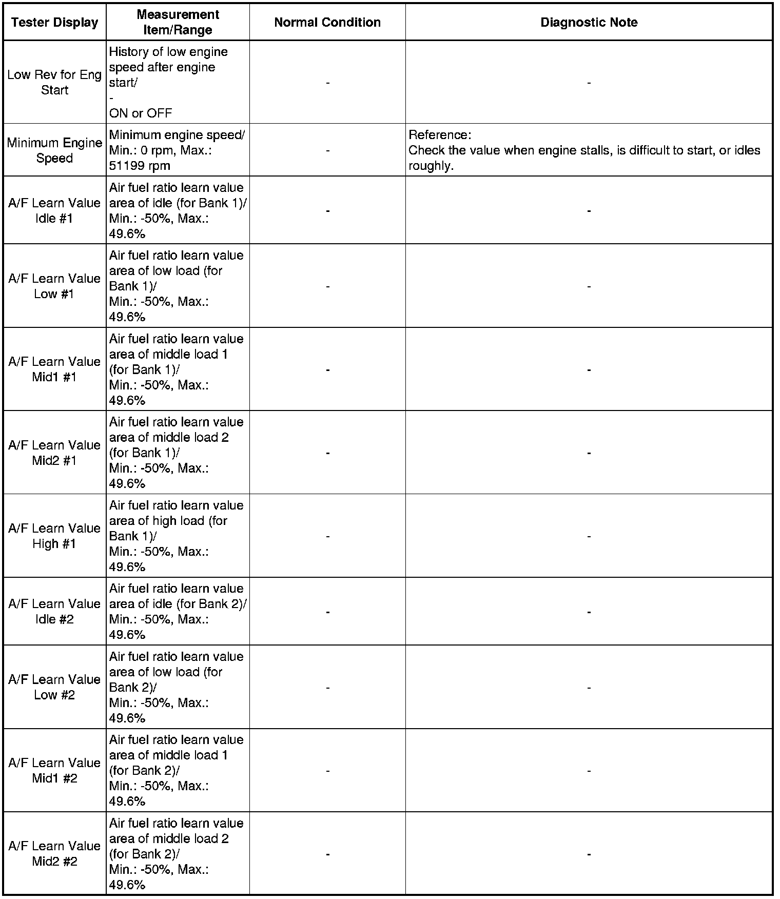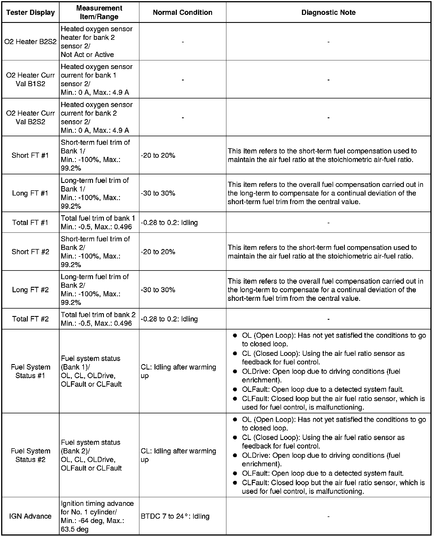 * Normal Condition: If no conditions are specifically stated for "idling", the shift lever is in N or P, the A/C switch is off and all accessory switches are off.