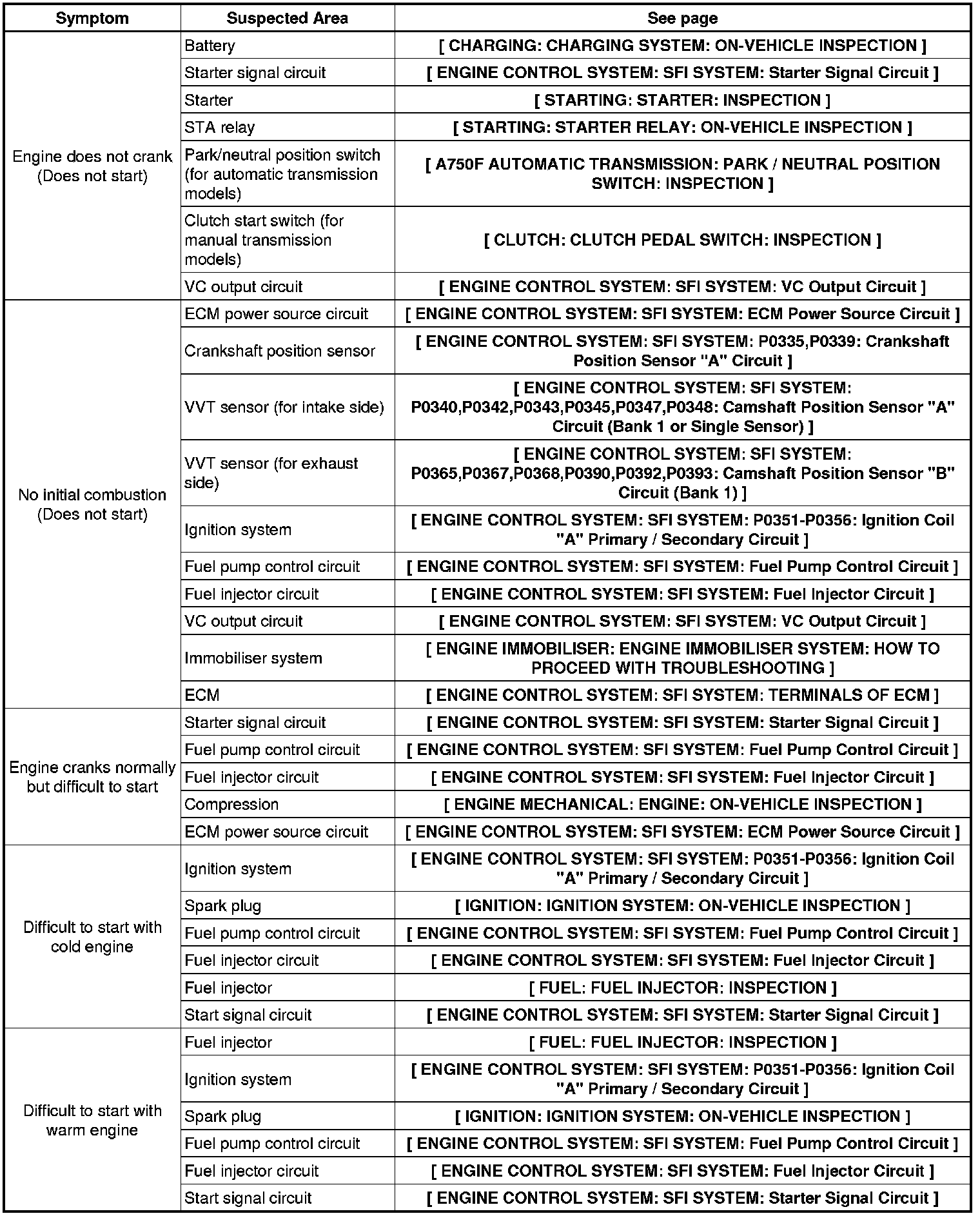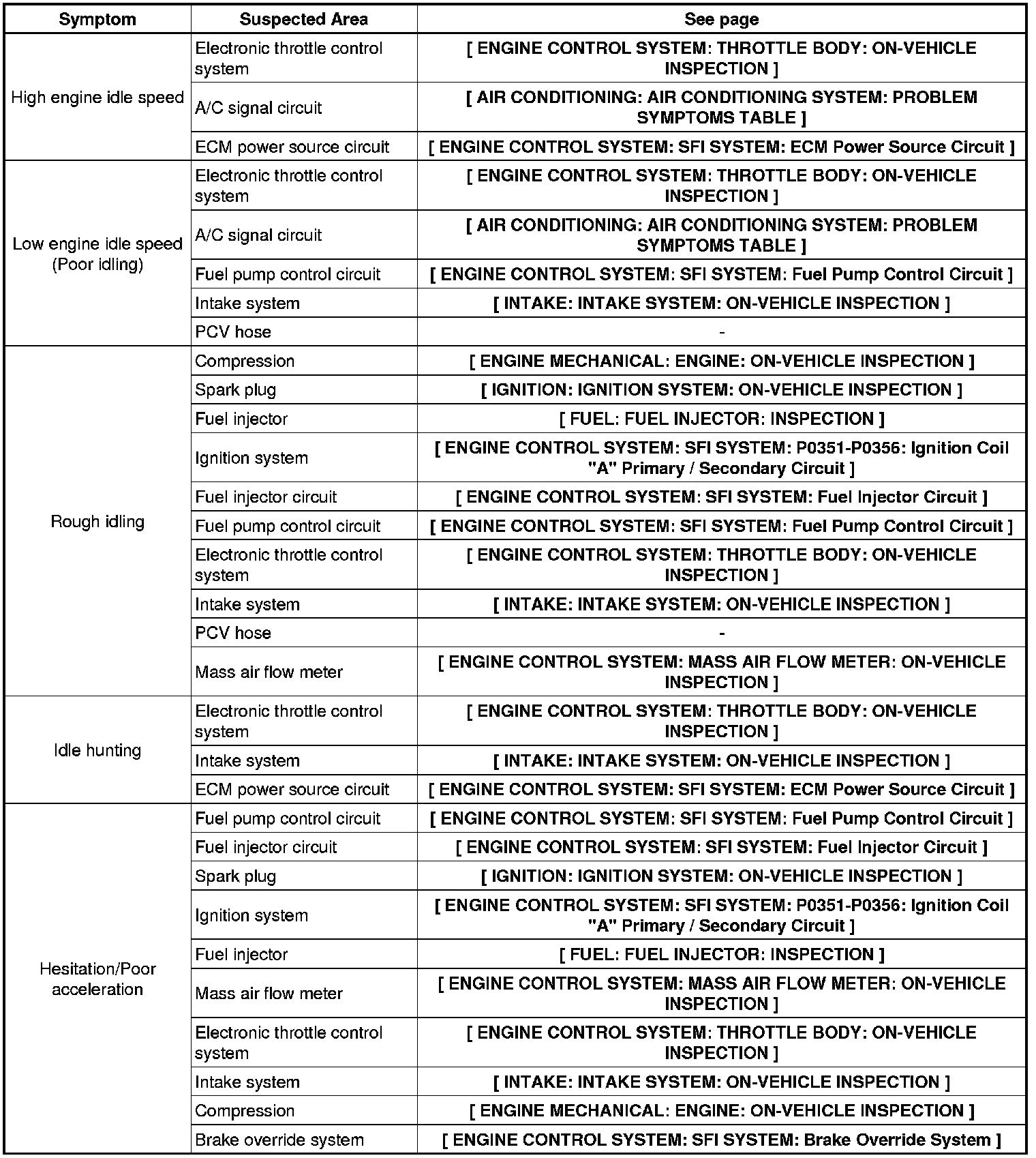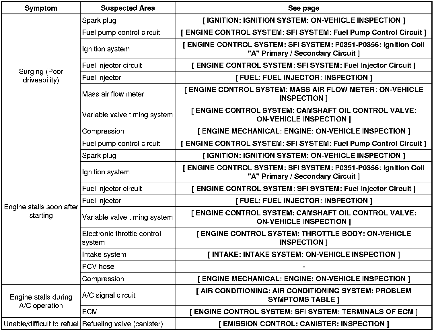 1GR-FE ENGINE CONTROL SYSTEM: SFI SYSTEM: PROBLEM SYMPTOMS TABLE