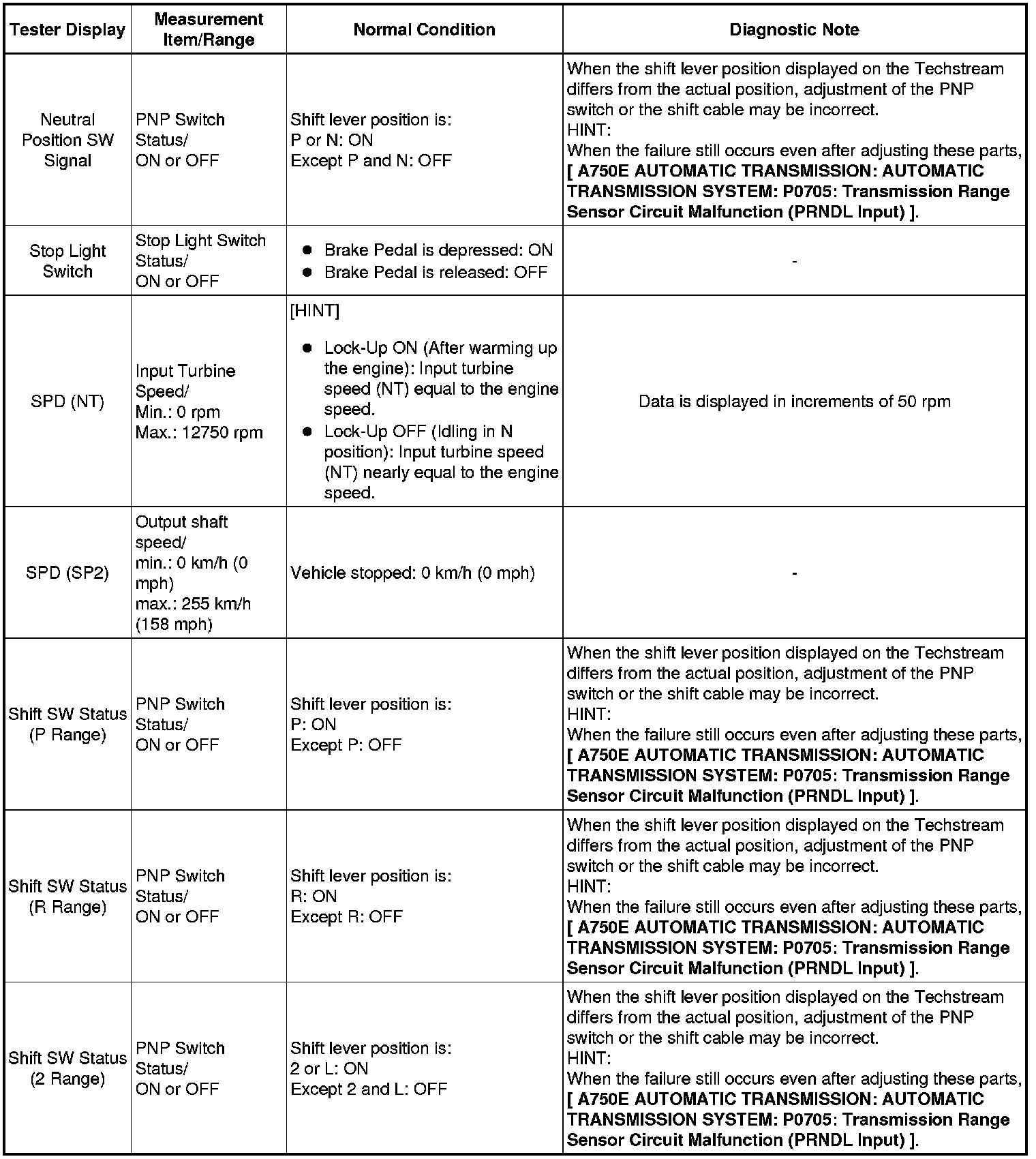 A750E AUTOMATIC TRANSMISSION: AUTOMATIC TRANSMISSION SYSTEM: DATA LIST / ACTIVE TEST