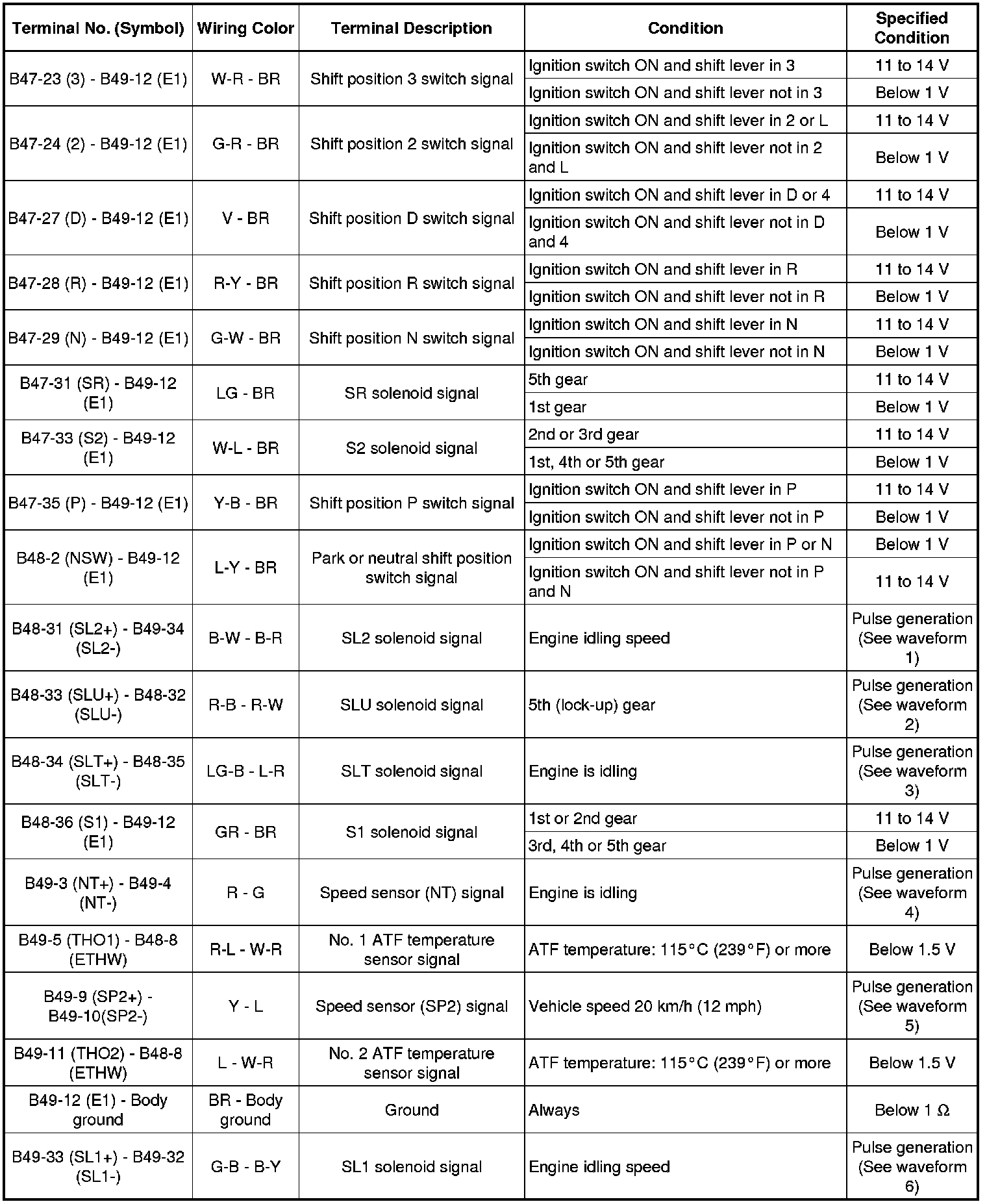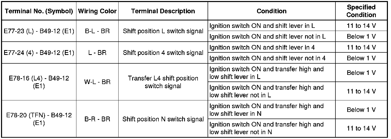 In the table, first follow the information under "Condition". Look under Terminal No. (Symbol) for the terminals to be inspected. The standard voltage and resistance between the terminals is shown under Specified Condition.