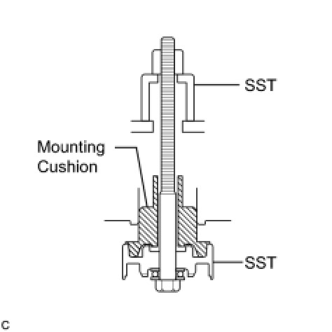 (b) Using SST, install the front suspension member body mounting front cushion as shown in the illustration.
