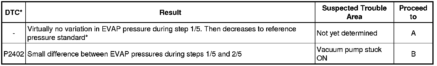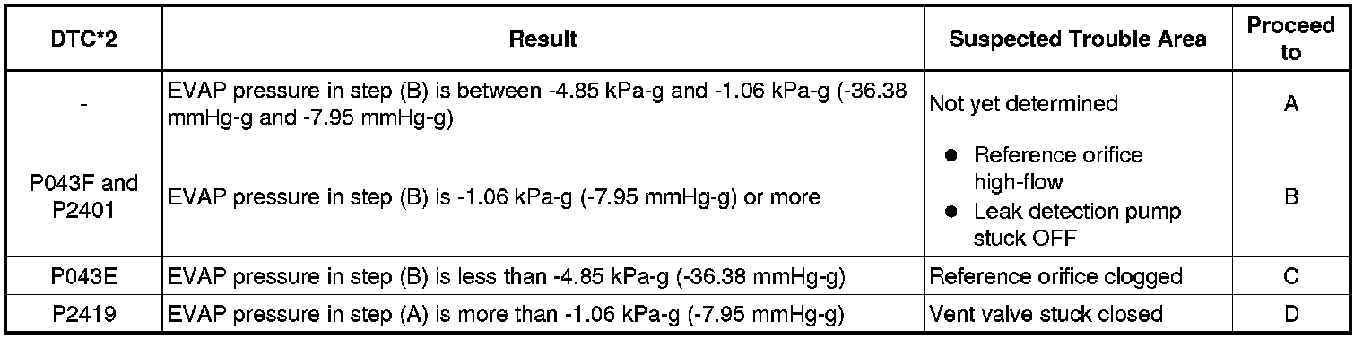 If the reference pressure difference between the first and second checks is more than the specification, the DTCs relating to the reference pressure (P043E, P043F, P2401, P2402 and P2419) are stored.