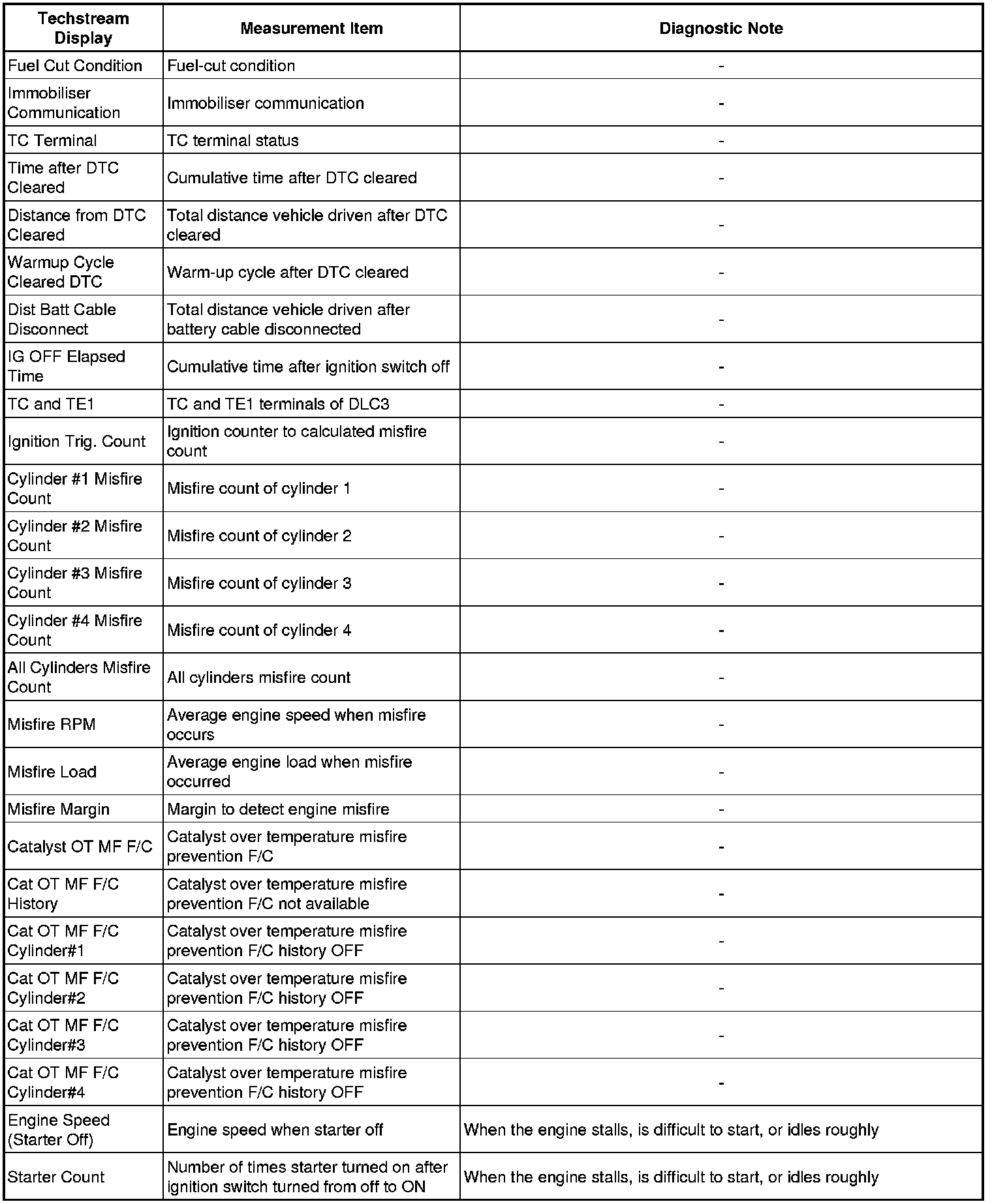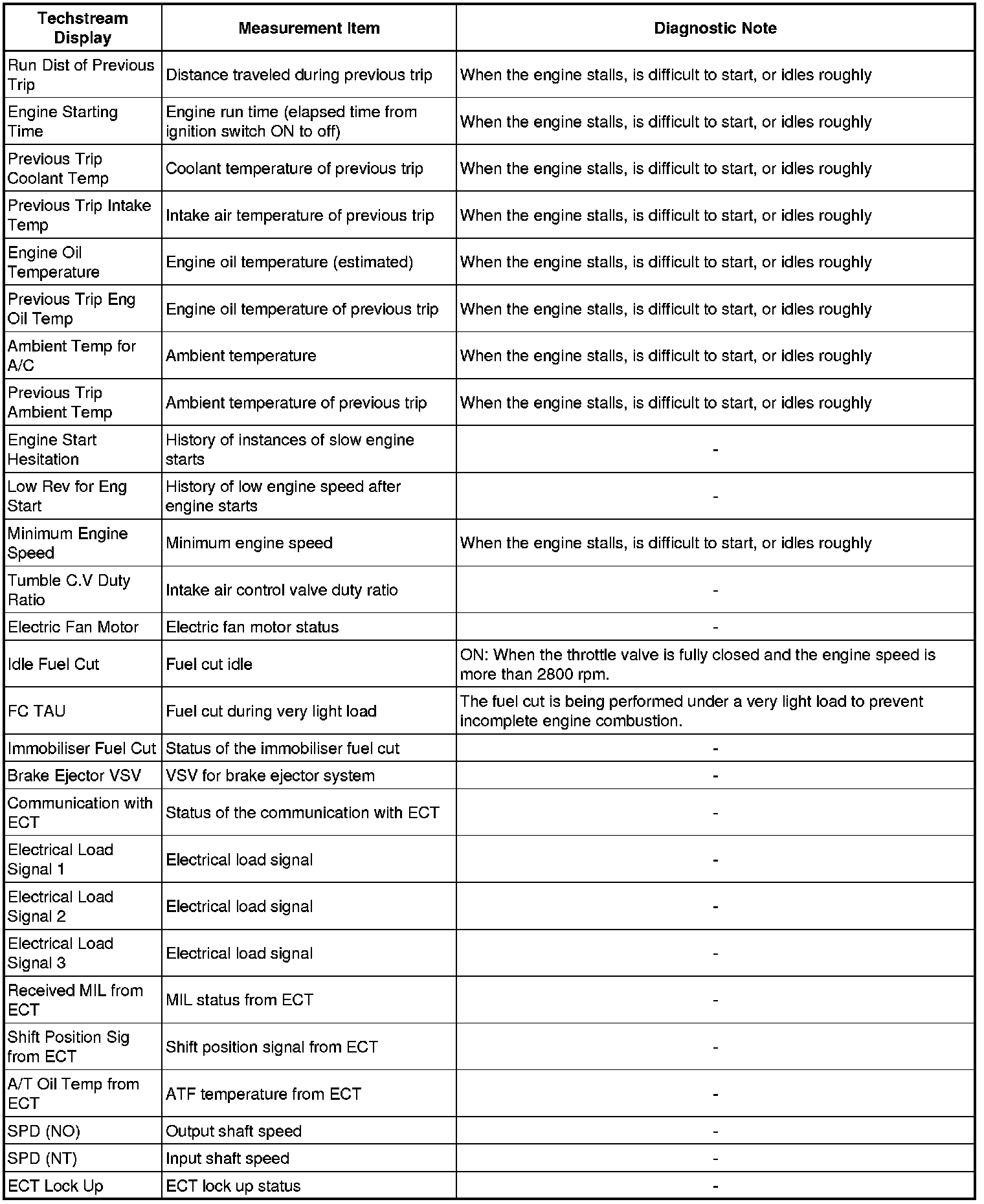 The ECM records engine conditions in the form of freeze frame data every 0.5 seconds. Using the Techstream, 5 separate sets of freeze frame data, including the data values at the time when the DTC is stored, can be checked.
