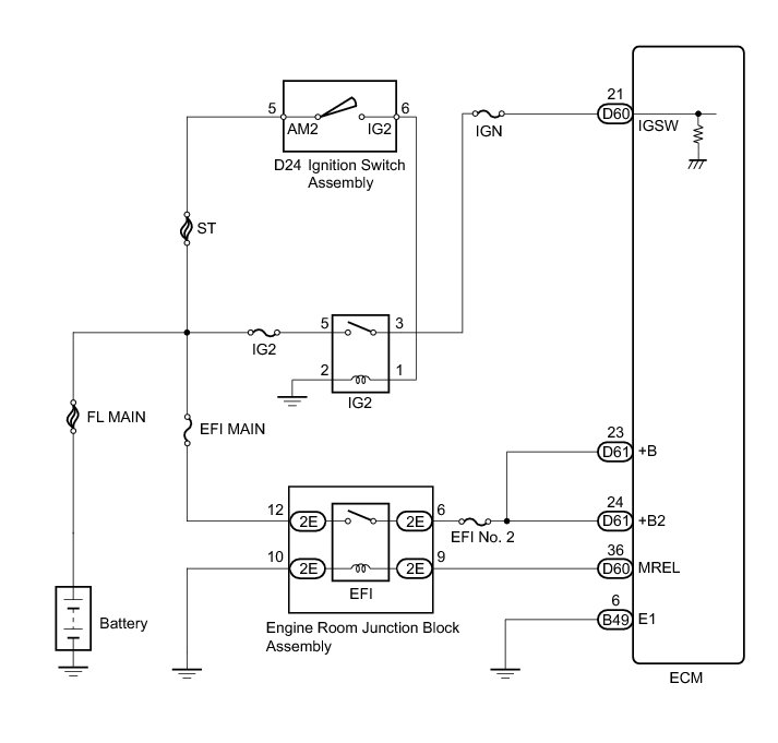 When the ignition switch is turned to ON, the battery voltage is applied to terminal IGSW of the ECM. The ECM MREL output signal causes a current to flow to the coil, closing the contacts of the EFI relay and supplying power to terminal +B, +B2 of the ECM.