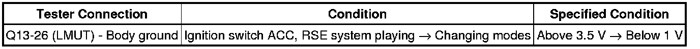 The mute signal is sent to reduce noise and a popping sound generated when switching the mode etc. If there is an open in the circuit, noise can be heard from the speakers when changing the sound source. If there is a short in the circuit, even though the navigation receiver assembly is functioning normally, no sound or only an extremely faint sound can be heard.