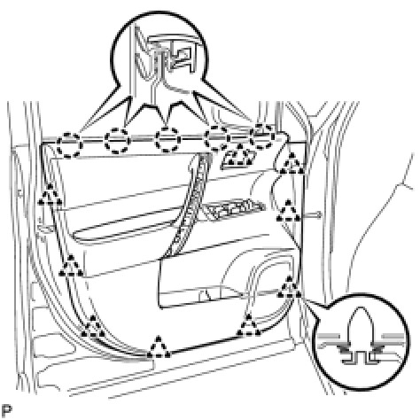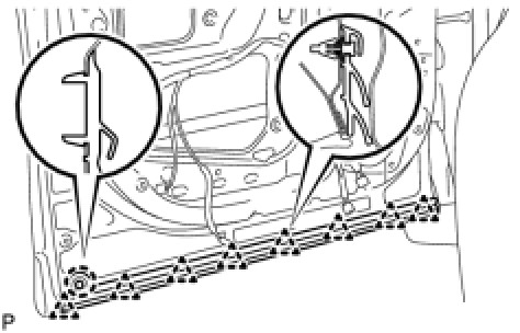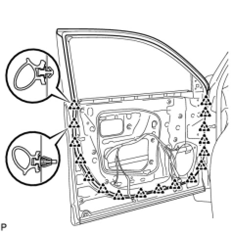 (a) Using a clip remover, disengage the 17 clips and remove the front door weatherstrip.