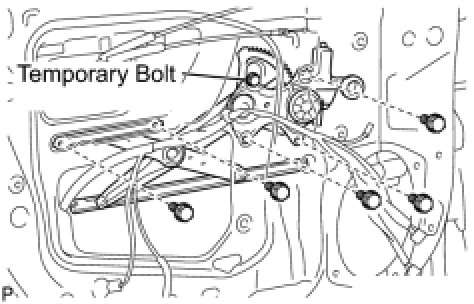 Do not remove the temporary bolt. If the temporary bolt is removed, the front door window regulator may fall and cause damage.