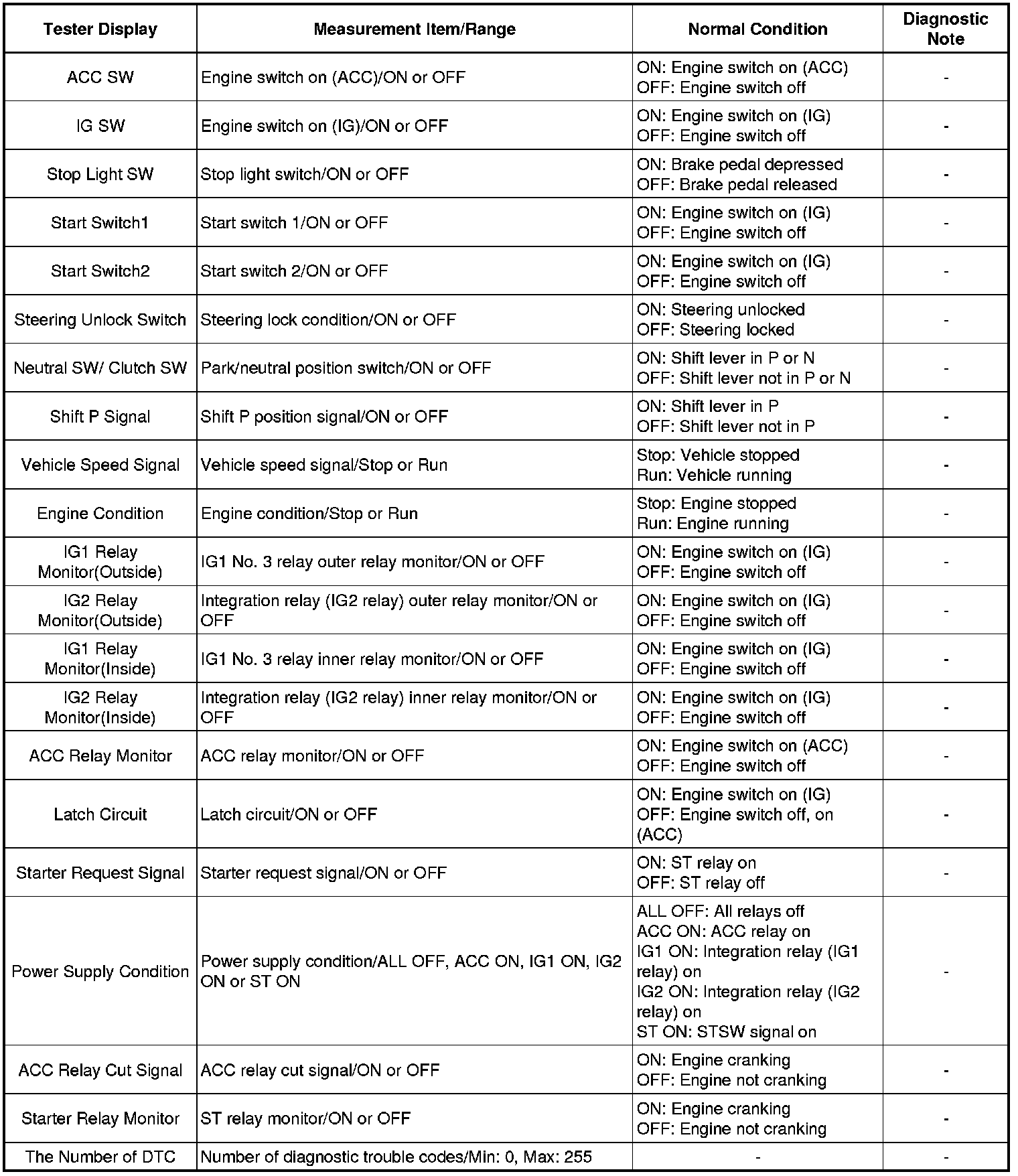 Using the Techstream to read the Data List allows the values or states of switches, sensors, actuators and other items to be read without removing any parts. This non-intrusive inspection can be very useful because intermittent conditions or signals may be discovered before parts or wiring is disturbed. Reading the Data List information early in troubleshooting is one way to save diagnostic time.