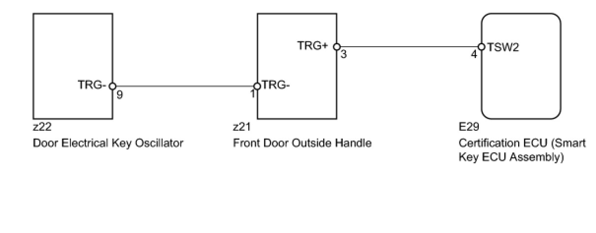 If the front passenger side door entry lock function does not operate but the entry unlock function operates, the communication line between the vehicle and electrical key transmitter is normal. The part at fault may be an entry lock switch circuit (certification ECU [smart key ECU assembly] -> front passenger side door outside handle [entry lock switch] -> front passenger side door electrical key oscillator).
