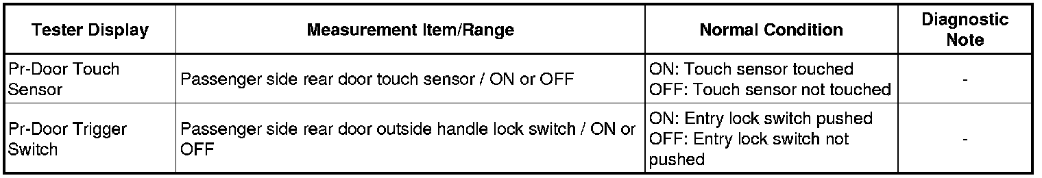 When the passenger side rear door entry lock and unlock functions do not operate, one of the following may be malfunctioning: 1) power door lock system, 2) passenger side rear door electrical key oscillator, or 3) certification ECU (smart key ECU assembly).