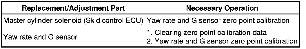 After replacing the yaw rate and G sensor, make sure to clear the zero point calibration data in the skid control ECU and perform zero point calibration.