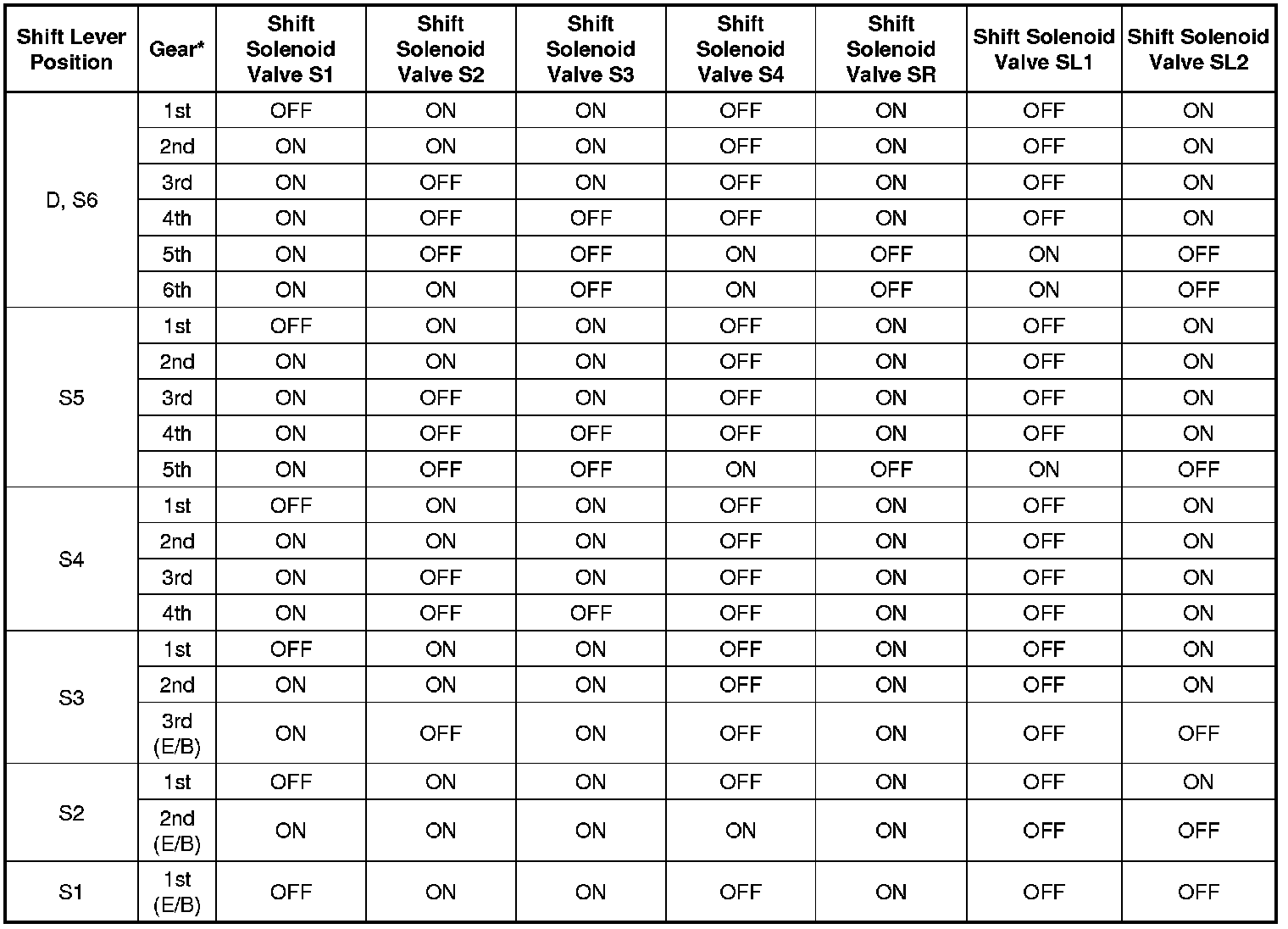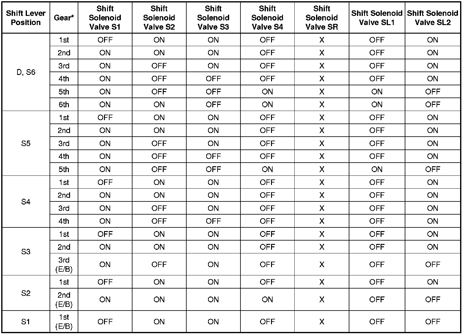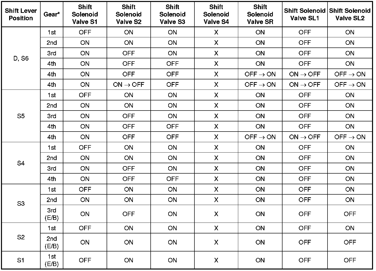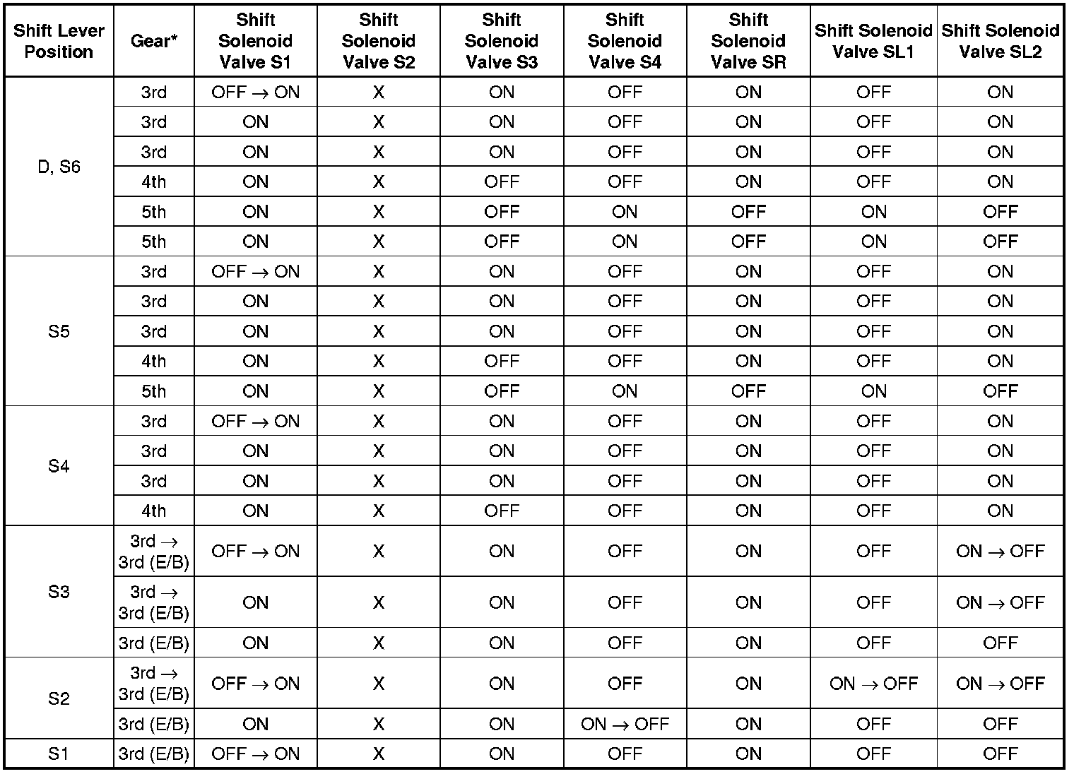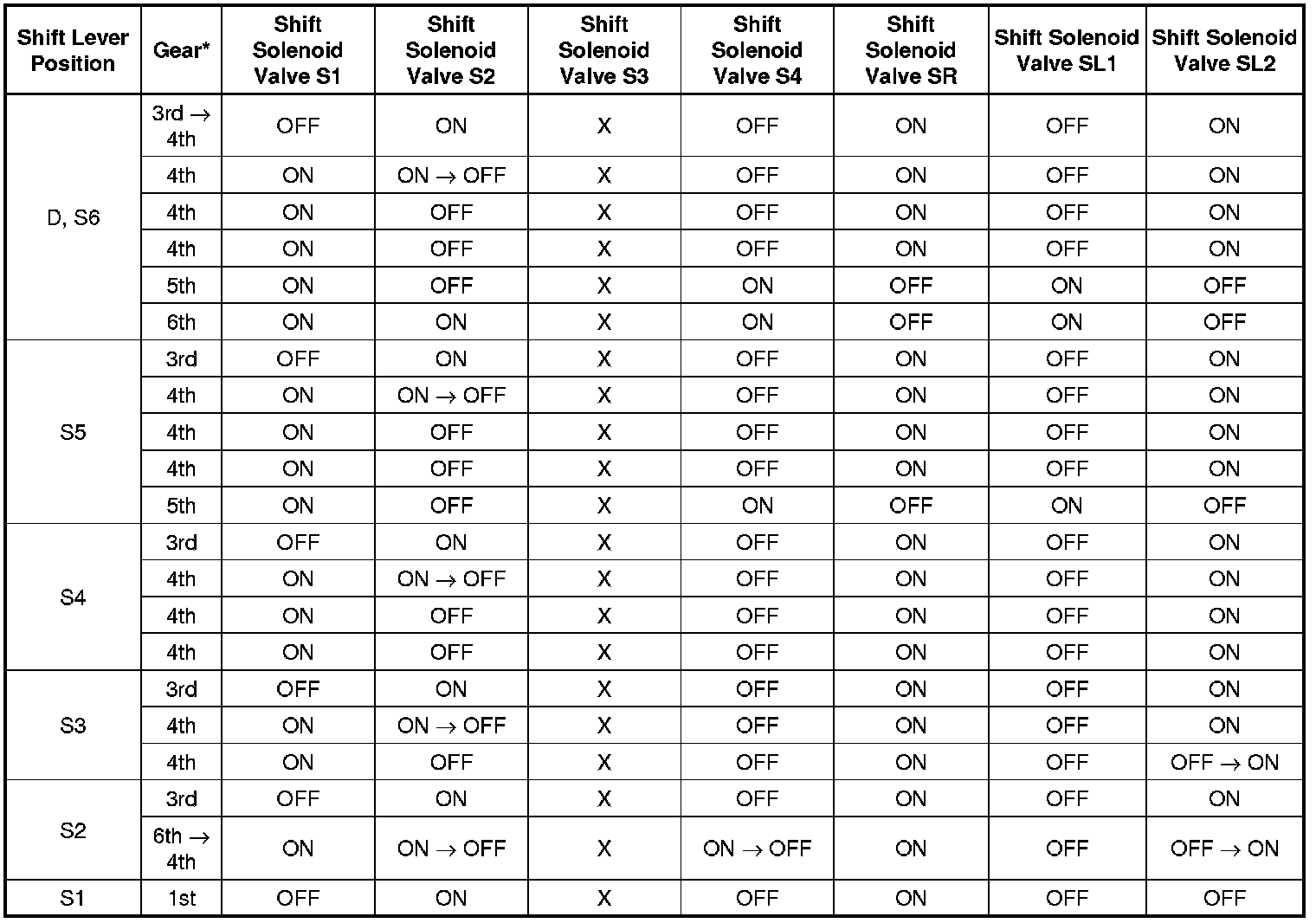 Shift Solenoid Valve Normal Operation Chart
