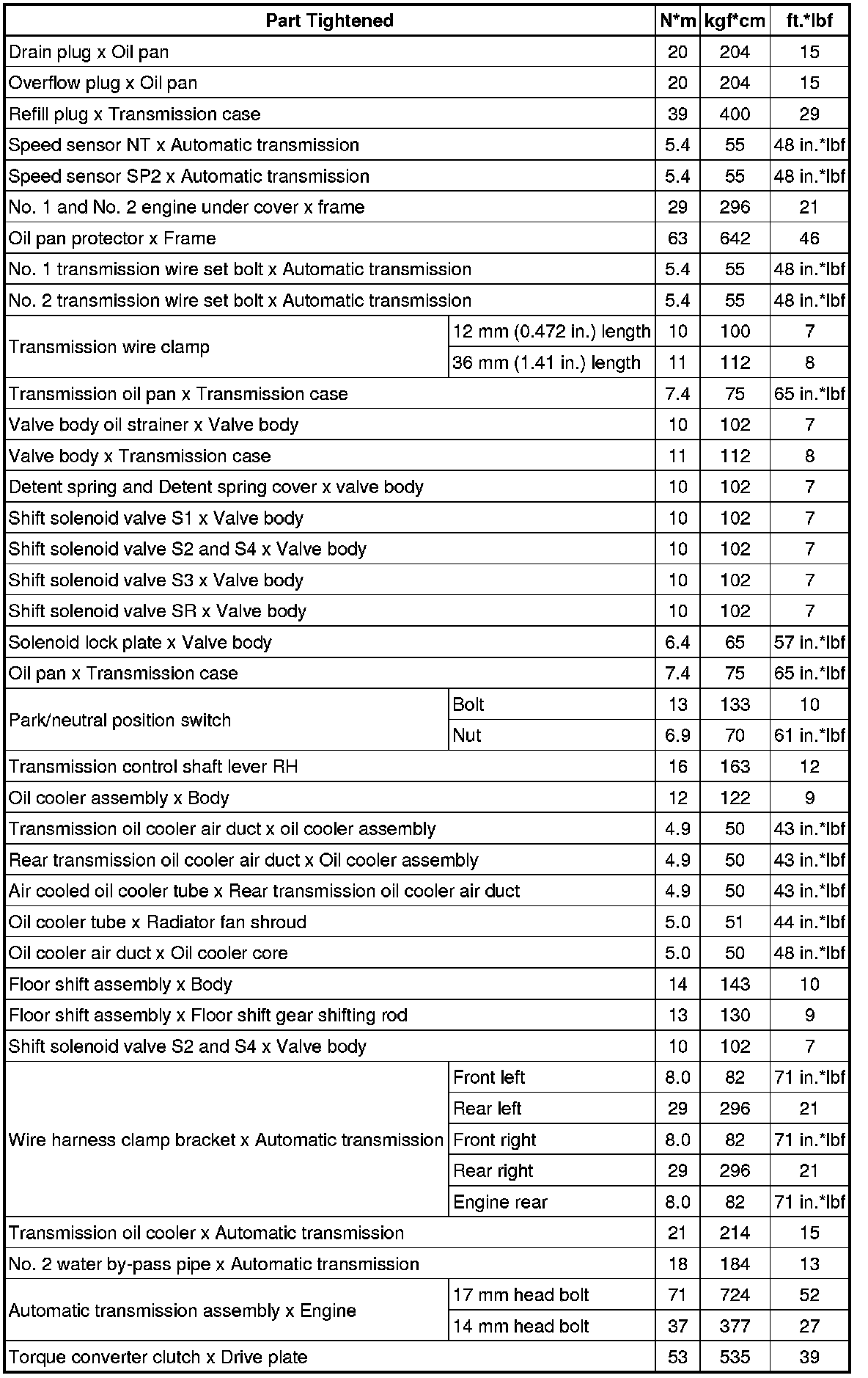 SPECIFICATIONS: AB60F AUTOMATIC TRANSMISSION / TRANSAXLE: TORQUE SPECIFICATIONS