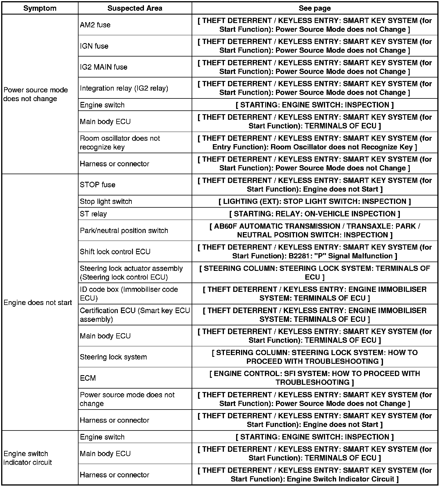 THEFT DETERRENT / KEYLESS ENTRY: SMART KEY SYSTEM (for Start Function): PROBLEM SYMPTOMS TABLE