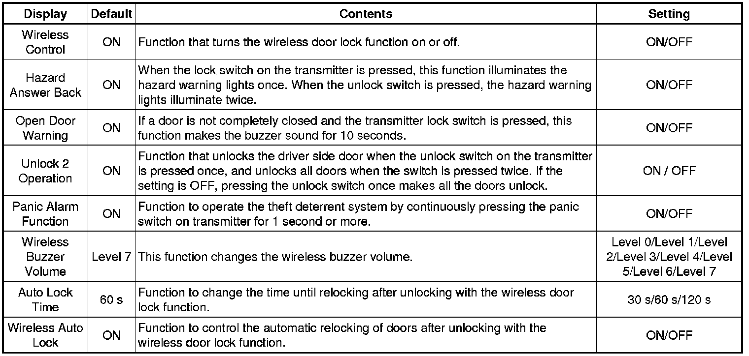* When the switches are pressed and held for 5 seconds, the entry door unlock mode changes in the following order: driver door unlock mode, all door unlock mode.