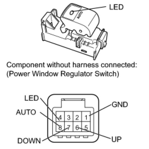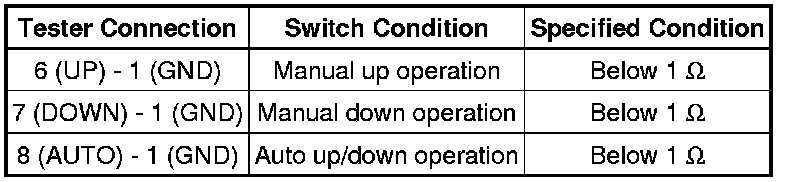 * If the result is not as specified, replace the power window regulator switch assembly.