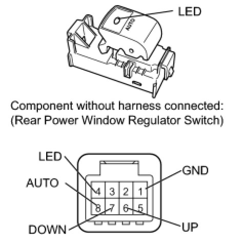 * If the result is not as specified, replace the rear power window regulator switch assembly.