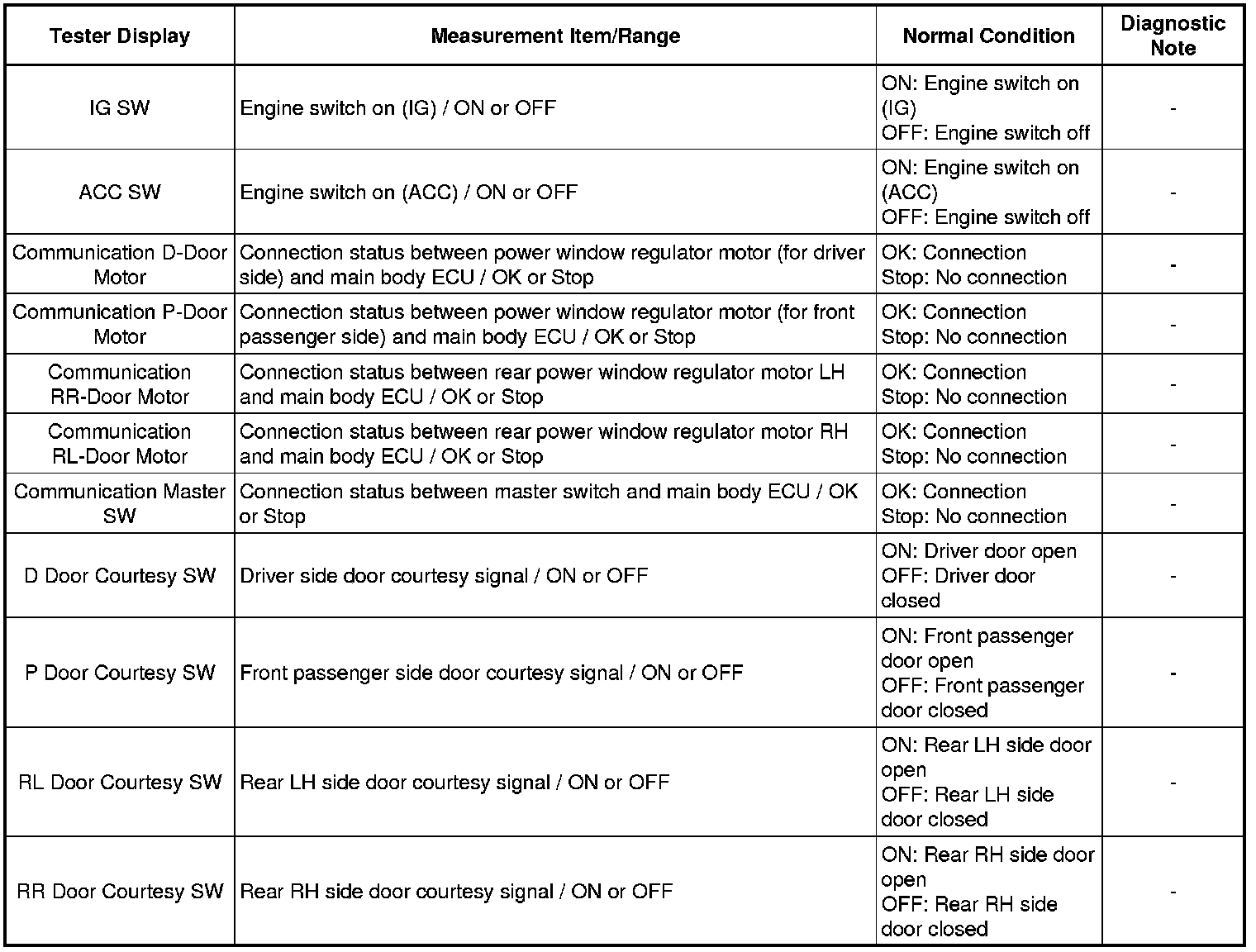 WINDOW / GLASS: POWER WINDOW CONTROL SYSTEM: DATA LIST / ACTIVE TEST
